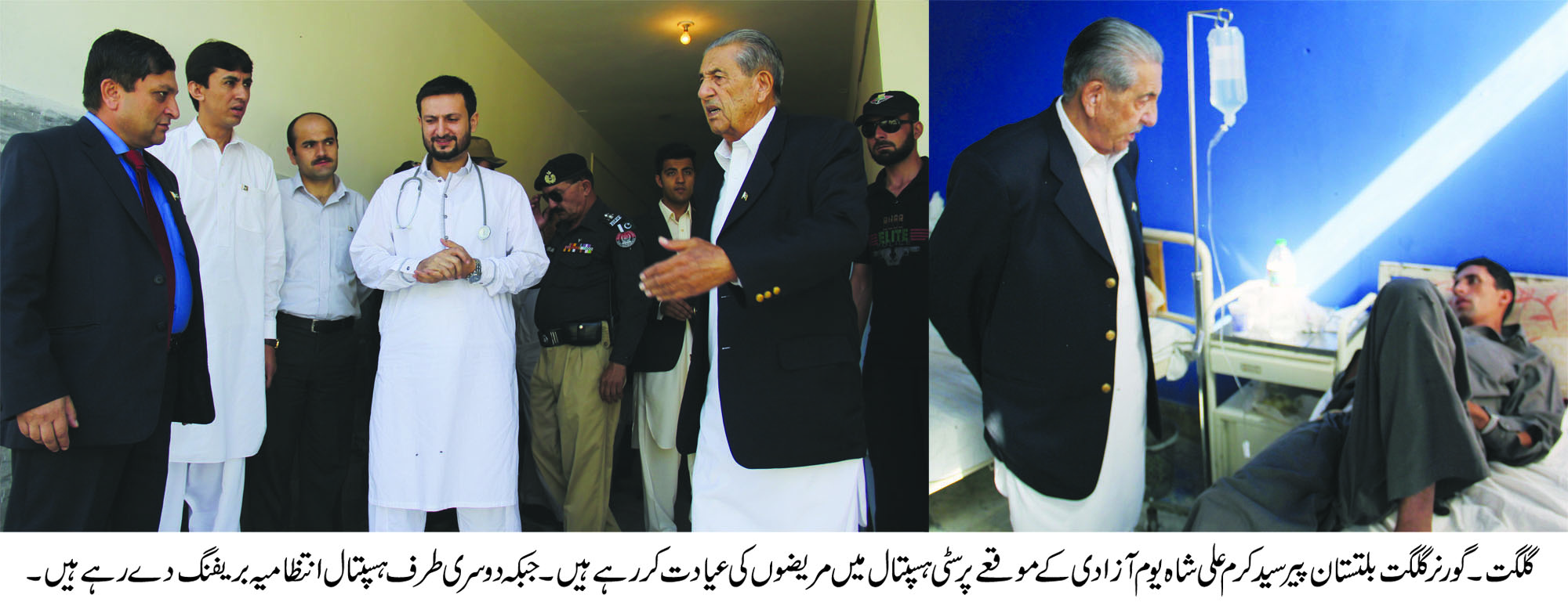 گلگت۔(پ۔ر)گورنر گلگت بلتستان پیر سید کرم علی شاہ نے جمعرات کے روز یوم آزادی کے موقعے پر سٹی ہسپتال میں مریضوں کی عیادت کی اور وہاں موجود صفائی کے ناقص انتظام پر برہمی کا اظہار کیا ۔گورنر گلگت بلتستان نے متعلقہ حکام کو ہدایت کی ہے کہ وہ ہسپتال کو تمام تر سہولتیں فوری طور پر بہم پہنچائیں تاکہ دور دراز سے آنے والے مریضوں کا بہتر انداز میں علاج ہو سکے ۔اس موقعے پر گورنر گلگت بلتستان پیر سید کرم علی شاہ نے سٹی ہسپتال کے مختلف وارڑذ کا دورہ بھی کیا اور وہاں ڈیوٹی پر موجود ڈاکٹروں اور مریضوں سے ان کے مسائل سنے ۔گورنر گلگت بلتستان نے یقین دہانی کرائی کہ وہ ہسپتال کے ضروریات کو پورا کرنے کے لیئے تمام تر وسائل بروئے کار لائینگے ۔گورنر گلگت بلتستان نے سٹی ہسپتال کے زیر تعمیر بلاک کو جلدی مکمل کرنے کرنے کے لیئے بھی ہدایات جاری کئیے ۔