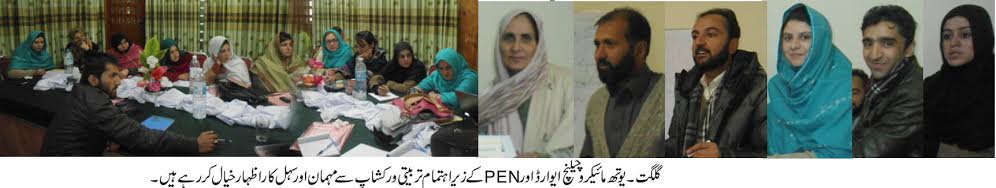 تفصیلات کے مطابق گلگت بلتستان کی متحرک سماجی و فلاحی تنظیم پبلشنگ ایکسٹینشن نیٹ ورک PEN کے زیر اہتمام AKRSP کیEELY پروجیکٹ کے تعاون سے گلگت بلتستان کے نوجوانوں کے لئے صنف کو مرکزی دھارے میں شامل کرنا (Gender Mainstreaming ) کے عنوان سے دو روزہ تربیتی ورکشاپ کا اہتمام کیا گیا۔ جس میں صنفی امتیاز،صنفی مساوات،صنفی انصاف،خواتین کے حقوق، خواتین کے مسائل، ضلع غذر میں خواتین کےخود کُشیوں کا بڑھتا ہوا رجحان اور Gender Mainstreaming جیسے اہم موضوعات پر سہل کاروں اعجاز احمد خان اور اشتیاق احمد یادنے تربیت فراہم کی۔