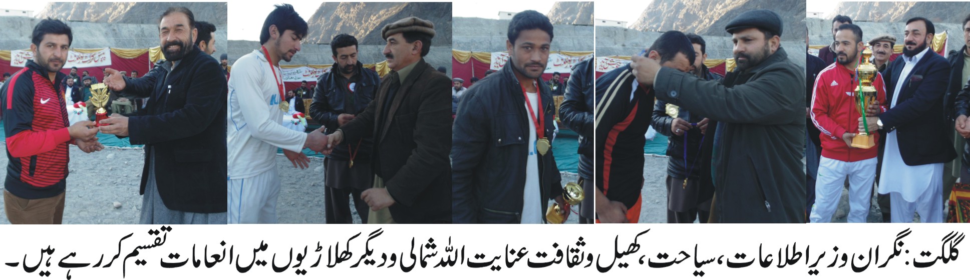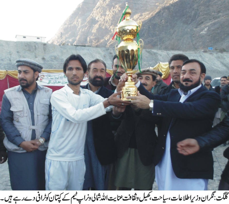 ان خیالات کااظہار عنایت اللہ شمالی وزیربرائے کھیل وثقافت ،انفارمیشن وامور نوجوانان گلگت بلتستان نے KIUگراؤنڈ میں امن کرکٹ ٹورنامنٹ کے فائنل میں عوام اور کھلاڑیوں سے خطاب کے دوران کیا۔ یہ کرکٹ ٹورنامنٹ سپورٹس کمیٹی دنیورکے زیراہتمام منعقدہواتھا۔ فائنل مقابلہ قراقرم ٹیکنیکل کرکٹ کلب اور دنیور سولجرکرکٹ کلب ،کے مابین کھیلاگیا جوکہ قراقرم ٹیکنیکل کرکٹ کلب نے جیت لیا۔ اس موقع پر مہمان خصوصی عنایت اللہ شمالی نے سپورٹس کمیٹی دنیور کیلئے مبلغ 10,000/-روپے جبکہ ونرٹیم کے لئے 5000اور رنراپ ٹیم کے لئے 3000روپے کااعلان کیا۔ قبل ازیں مہمان خصوصی کی خدمت میں کمیٹی کی طرف سے مشتاق حسین نے سپاسنامہ پیش کیا اورمطالبہ کیاکہ دنیور میں کھیلوں کے انعقاد، بہت جلد فٹ بال ٹورنامنٹ اور دنیورمیں فٹ بال گراؤنڈ کی تعمیر کے ساتھ ساتھ دنیور کے حلقہ نمبر3کے کھلاڑیوں کوعلاقائی اورقومی سطح کے مقابلوں میں عنایت اللہ شمالی نے تمام مطالبات پرفوری عملدرآمد کاااعلان کیا۔