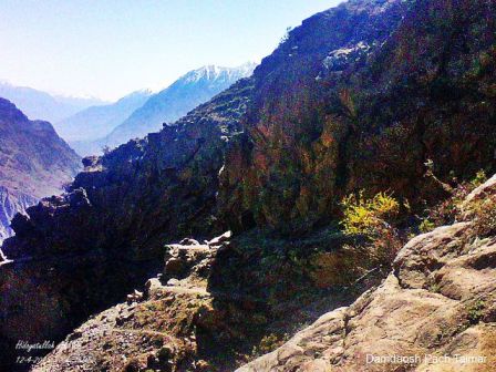 تھوڑی دیر دم لینے اور پھل سے شکم کو بہلا کر اپنے سفر کا دوبارہ آغاز کیا۔فیروز صاحب بڑے دیندار آدمی وہ ہمیں اسلامی معلومات کے ساتھ ساتھ دال چوریٹی اور ٹیمر گائوں کے متعلق بھی معلومات فراہم کر رہے تھے ۔ہلتر اور کارگاہ گلگت والوں کی چراگاہیں اورایندھن لکڑی مہیا کرنے کے ذرائع ہیں اور ابھی تک لوگ اس سے استفادہ حاصل کر رہے ہیں۔ ہمارا موضوع بھی یہی ایندھن تھا اب اس ایندھن کو پورا کرنے کے لئے ان خوبصورت جنگلوں کا کیا حال بنا ہے وہ ایک الگ کہانی ہے جس کا ذکر آگے جاکر آئیگا ۔۔مجھے یاد پڑتا ہے جب میں سکول میں تھا تو میں گلگت بازار میں لکڑی سے لدھے گدھوں کو اکثر دیکھا کرتا تھا اور جو لوگ اس کام سے منسلک تھے انہیں شینا زبان میں جُکوٹھیکیدار(لکڑی کے ٹھکیدار) کہا جاتا تھا ۔یہ ستر کی دھائی کی بات ہے۔اور آج اللہ کا کتنا کرم ہے کہ لوگ کھاتے پیتے کہلاتے ہیں ۔یہ اللہ کی دین ہے جسے چاہئے چھپر پھاڑ کے دے۔چلتے چلتے فیروز نے ایک اور بات بھی بتائی کہ اس راستے میں( راستہ کیا ہے پل صراط کہا جائے تو مناسب ہوگا )اور اسی پل صراط میں ہزاروں گدھوں نے انسانی خدمت بجا لاتے ہوئے اپنی جانوں کو اسی انسان پہ نچھاور کیا جو اپنے آپ کو اشراف المخلوقات کہلاتا ہے لیکن کام ایسے کرتا ہے گدھے بھی اس سے دور رہنے لگے ہیں وہ اس لئے کہ اب یہ انسان خود ایک دوسرے کو گدھا کہتے ہیں ایسے میں ان گدھوں نے سوچا ہوگا کہ اب یہ خود گدھے ہیں تو ہماری کیا ضرورت ہے ۔۔باتوں باتوں میں وہ پل صراط بھی آہی گئی جہاں ہزاروں گدھے لقمہ گھاٹی بن گئے تھے۔اس جگہ کا نام دم دروش پچ ہے ۔یہاں پہنچے تو تھوڑا سا خوف طاری ہوا ۔ایک تو پگڈنڈی تنگ اور دوسری ہزاروں فٹ نیچے تنگ گھاٹی ۔اف میرے خدا کیسے ان گدھوں کو لکڑی سمیت کراس کیا جاتا تھا ۔اب تو ماشااللہ یہ تنگ پگڈنڈی کچھ بہتر بھی ہے بحر الحال ہم نے یہ پگڈنڈی پار کرلی یہ تقریباً تین سو سے چار سو میٹر پر مشتمل ہے اگر حکومت اس حصے کو تھوڑا چوڑا کرے تو لوگوں اور چوپایوں کے لئے گزرنے میں آسانی ہو اور راستہ بنانا خلق خدا کے لئے بڑا ثواب کا کام بھی ہے
