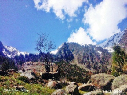 چاروں طرف قدرت چھلک رہی ہو اور قدرت کے ان حسین نظاروں کے بیج چائے کی ایک دیگچی چڑھی ہو اور چائے کا جوش اور اسے بنانے والا اور دور پہاڑوں میں چروہا اپنے ریوڑ کے ساتھ سیٹیاں نکالتا ہوا کیسا منظر ہوگا۔یہ تو وہی جان سکتا ہے جو ان راہوں کا مسافر ہوتا ہے اور خوش قسمتی سے آج ہم بھی ایسے راہی بن گئے تھے اور حقیقت میں ایسے ہی منظر سے لطف اٹھا رہے تھے۔جو شاہد ہمیں خواب میں بھی نہ ملتے۔چائے جوش آچکی تھی اور ہمارا ساتھی چائے کو پیش کرنے کے لئے اسے پیالوں میں انڈیل رہا تھا۔ اور میں دور پہاڑوں کو ٹکٹکی باندھے قدرت کے شہکار اور کاریگری پہ دم بخود نہ جانے کس اور چلا گیا اور ساتھی کی آواز پہ چونکا تو میرے سامنے چائے تھی۔۔۔چائے نوش کرتے ہوئے گپ شپ کا اپنا ایک الگ مزا ہوتا ہے۔تاج میر مجھے بتا رہا تھا کہ گرمیوں کے موسم میں غالی (یہ شینا لفظ ہے جس کو تین مختلف زمروں میں استعمال کیا جاتا ہے ۔۔ایک تو یہ درہ کے لئے دوسرا راستے اور تیسرا چوٹی کے لئے ) ہلتر غالی کی بات ہو رہی تھی اس غالی کو صرف جولائی اور اگست کے مہنے میں مخصوص جگہوں سے کراس کیا جا سکتا ہے ۔ باقی سارا سال یہ برف سے ڈھکی رہتی ہے۔اس غالی سے متعلق یہ بتا دوں کہ اس کے دائیں طرف سے جب آپ سفر کرینگے تو شکیوٹ اور شروٹ کی چراگاہیں زوڑمن۔ کاں دار سے ہوتے ہوئے شروٹ شکیوٹ تک رسائی پا سکتے ہیں جبکہ اس کے بائیں راستے سے غالی کراس کرتے ہوئے آپ کارگاہ کی حسین اور دلفریب وادی لنگ اور جُت کے حُسن کا دیدار کر سکتے ہیں ۔لیکن اس کے لئے آپ کو دودھ پینے والا مجنون نہیں خون دینے والا مجنون بننا پڑیگا۔۔میرا مطلب یہ ہے کہ یہ حسین نظارے مہم جوئی ہی سے دیکھے جا سکتے ہیں ۔ہماری مہم جوئی بھی ہلتر تک ہی کی تھی اور اسی مہم جوئی میں ہم ہلتر غالی کے درمیانی حصے تک ہو آئے اور اپنی زندگی کے حسین یادوں کے باب میں ہلتر کا عنوان کا اضافہ کر دیا۔