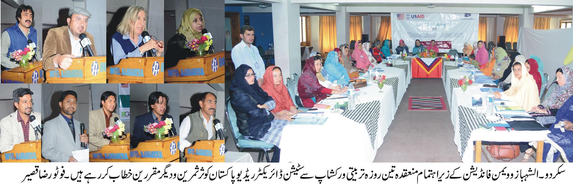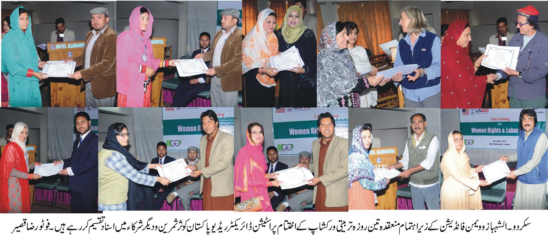 لشہباز تنظیم کے زیر اہتمام خواتین کی حقوق اور لیبر لاء سے آگاہی کیلئے تین روزہ تربیتی ورکشاپ اختتام پذیر ہوگیا۔ اس ورکشاپ میں سکردواور دیگرعلاقوں سے تعلق رکھنے والے گھریلو، سرکاری و نیم سرکاری اور پرائیویٹ اداروں میں کام کرنے والے چالیس خواتین کو تربیت دی گئی۔ ورکشاپ میں ماسٹر ٹرینرحسن جہانگیراور ذاکر حیات نے خواتین کو لیبر سیکٹر میں ہونے والی امور پر تفصیلی معلومات فراہم کی جس میں لیبر لاء ،ٹریڈ یونین، ہراساں کرنا، امتیازات اور برابری شامل ہے۔