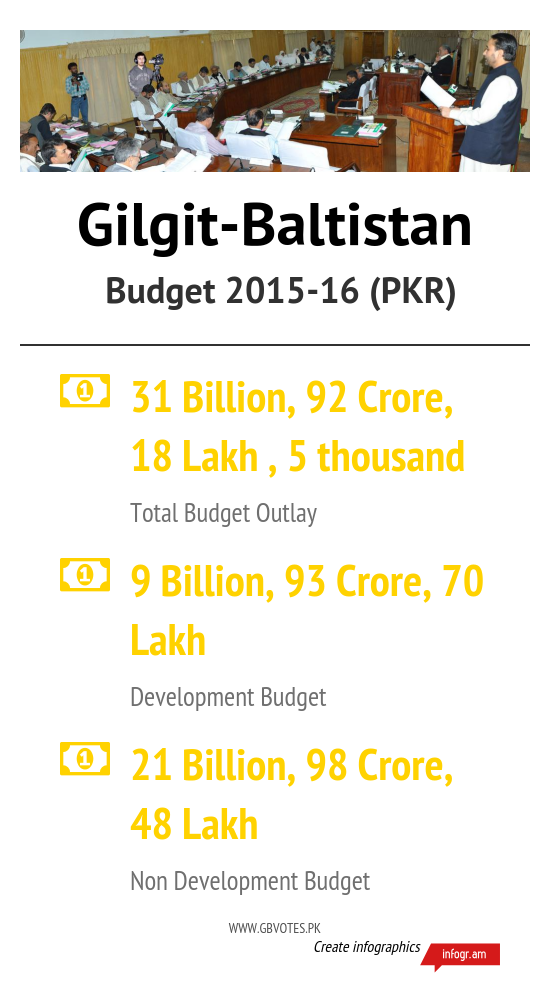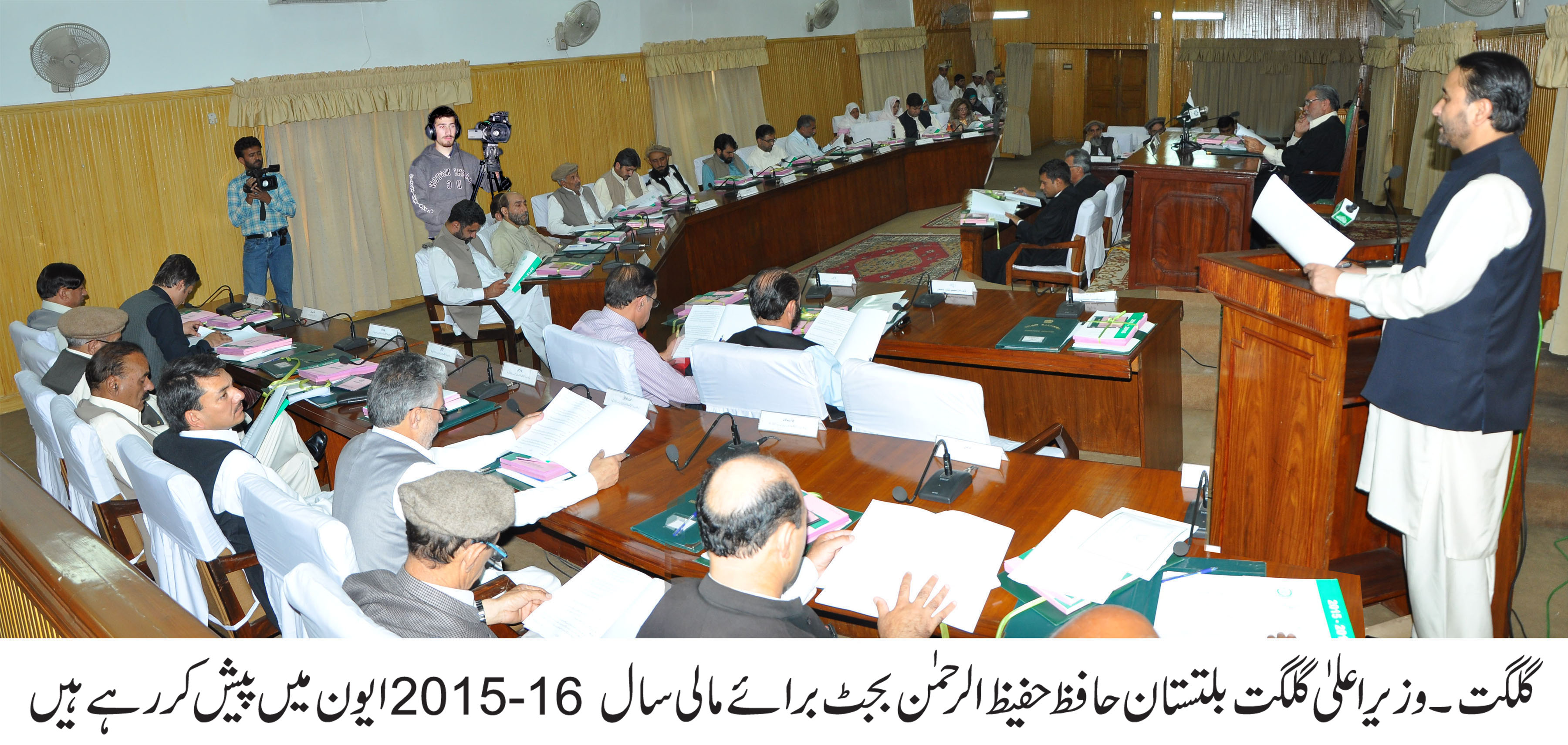 اتوار کی سہ پہر تین بجے جب نو منتخب قانون سازاسمبلی کا بجٹ اجلاس شروع ہوا تو اسپیکر اسمبلی حاجی فدا محمد ناشاد نے وزیراعلیٰ حافظ حفیظ الرحمٰن کو دعوت دی کہ وہ گلگت بلتستان کا سالانہ بجٹ سال 2015-16 ایوان میں پیش کرے ۔ جس پر وزیراعلیٰ گلگت بلتستان حافظ حفیظ الرحمٰن نے بجٹ تقریر کرتےہوئے کہا کہ حکومت نے انتہائی مختصر دورانیئے میں ایک عوام دوست بجٹ پیش کیا ہے امید ہے یہ ایوان بجٹ میں اپنی کارآمد تجاویز کو سامنے لا کر اسے مزید بہتر بنانے میں حکومت کی معاونت کرے گا۔