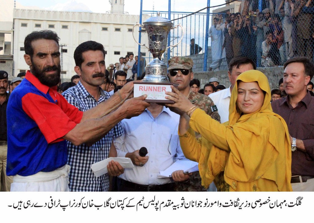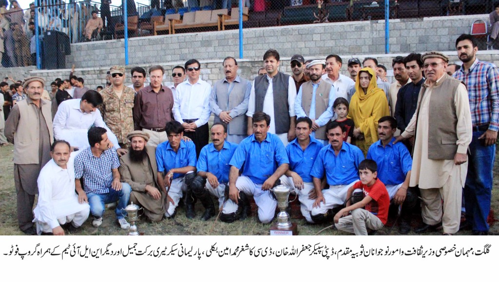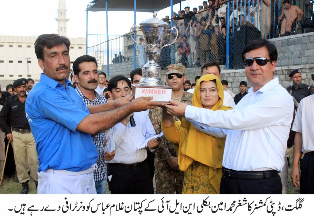 گلگت( فرمان کریم) پاک چائینہ فرینڈ شپ پو لو ٹورنامنٹ این ایل آئی نے اپنے نام کیا۔ہفتے کے روز کھیلے گئے میچ میں این ایل آئی کی ٹیم نے 1کے مقابلے میں 10گول سے پولیس ٹیم کو ہرا کر ٹرافی جیت لیا۔ میچ کے مہمان خصوصی وزیر ثقافت و امور نوجواناں ثوبیہ مقدم تھی۔ ڈپٹی سپیکر قانون ساز اسمبلی گلگت بلتستان جعفر اللہ خان، پارلیمانی سیکرٹیری برکت جمیل اور ہمسائیہ ملک چین سے آئے ہوئے مہمانوں ڈپٹی کمشنر کاشغر محمد امین بکلی اور دیگر مہمانوں نے شرکت کی۔ میچ کے آخر میں وزیر ثقافت ثوبیہ مقدم اور ڈپٹی کمشنر کاشغر محمد امین بکلی نے ونراور رنر اپ ٹیموں کے کپتانوں میں ٹرافی تقسیم کئے۔ ہمسائیہ ملک چین سے آئے ہوئے مہمانوں کے اعزاز میں پاک چائینہ فرنیڈ شپ پولو میچ کا خصوصی انعقاد کیا گیا تھا۔