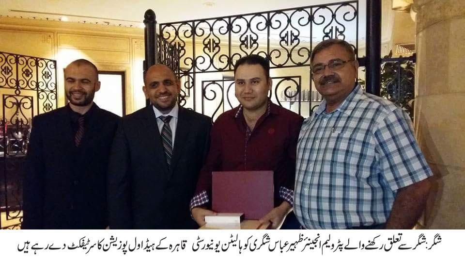شگر(عابد شگری)شگر سے تعلق رکھنے والے ہونہار انجینئرظہیرعباس شگری نے ہالیٹن یونیورسٹی قاہرہ میں LWDکورس میں پہلی پوزیشن حاصل کرکے پاکستان کا نام ایک بار پھر بلند کردیا۔تفصیلات کیمطابق شگر الچوڑی سے تعلق رکھنے والے پٹرولیم انجینئر ظہیر عباس شگری نے قاہر ہ مصر کے ہالیٹن یونیورسٹی میں ہونے والے ایڈوانس کورس LWDمیں پاکستان کی نمائندگی کرتے ہوئے حصہ لیاجس میں پاکستان سمیت بارہ ملکوں کے انجینئرزشامل تھے۔یہ کورس 15جون 2015سے 15ستمبر تک جارہ رہا۔کورس میں شامل انجینئرز کا تعلق انڈونیشیاء ،برطانیہ،چائنا ،فرانس،آسٹریلیا،روس و دیگر ممالک شامل تھے۔اور پاکستان کے کسی بھی انجینئر نے پہلی بار پہلی پوزیشن حاصل کی ہے۔شگر کے مختلف شعبوں سے تعلق رکھنے والے افراد نے انجینئر ظہیر عباس شگری کی شاندار کامیابی پر انہیں مبارکباد پیش کیا۔