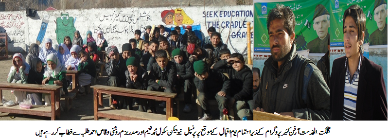 ان خیالات کا اظہار محسن خان ایف ایس او الخدمت آرفن کیئر پروگرام گلگت نے اپنے ایک اخباری بیان میں کہا۔ انہوں نے کہاکہ ہم پورے سال الخدمت آرفن کیئر پروگرام کے زریعے سے گلگت کے تمام رجسٹرڈ بچوں کو مختلف پروگرامات اور مقابلوں سے ان بچوں کے ٹیلنٹ کو اجاگر کرنے اور انہی بچوں کو معاشرے کو دوسرے بچوں کے برابر لانے کی کوشش کرتے ہے تاکہ ان بچوں کو بھی ایک فورم مہیا ہوسکے جہاں پر یہ بچوں سیکھے اور پڑھے اور ان میں مایوسی کا خاتمہ ہوسکے۔