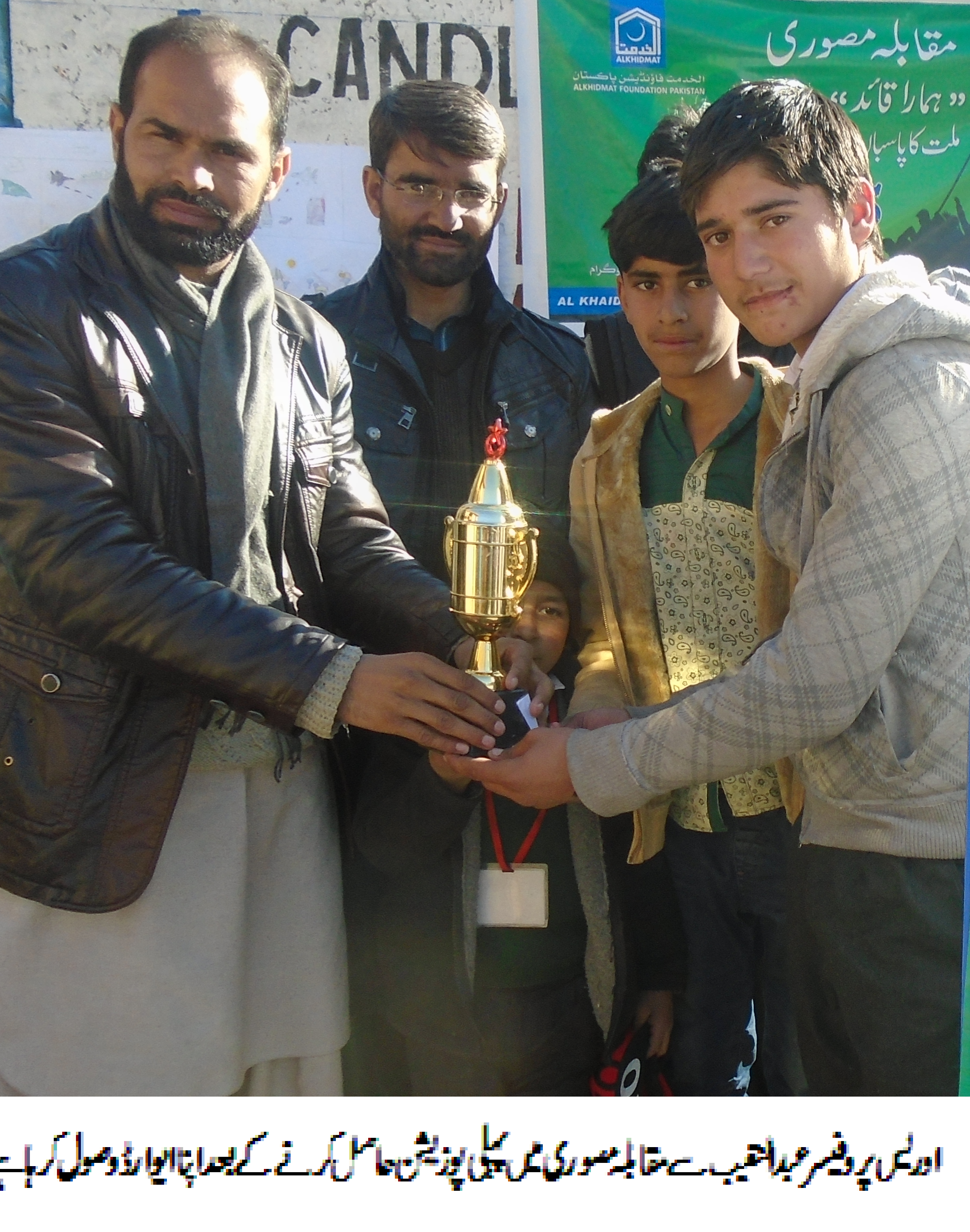 گلگت (پ ر) الخدمت آرفن کیئر پروگرام گلگت کے زیر اہتمام نیو بیکن پبلک سکول بسین پائن میں یوم قائد کے موقع پر مقابلے مصوری کا انعقاد کیا گیا ۔ جس میں الخدمت آرفن کیئر پروگرام میں رجسٹرڈ بچوں کے علاوہ دیگر بچوں نے بھی حصہ لیا۔