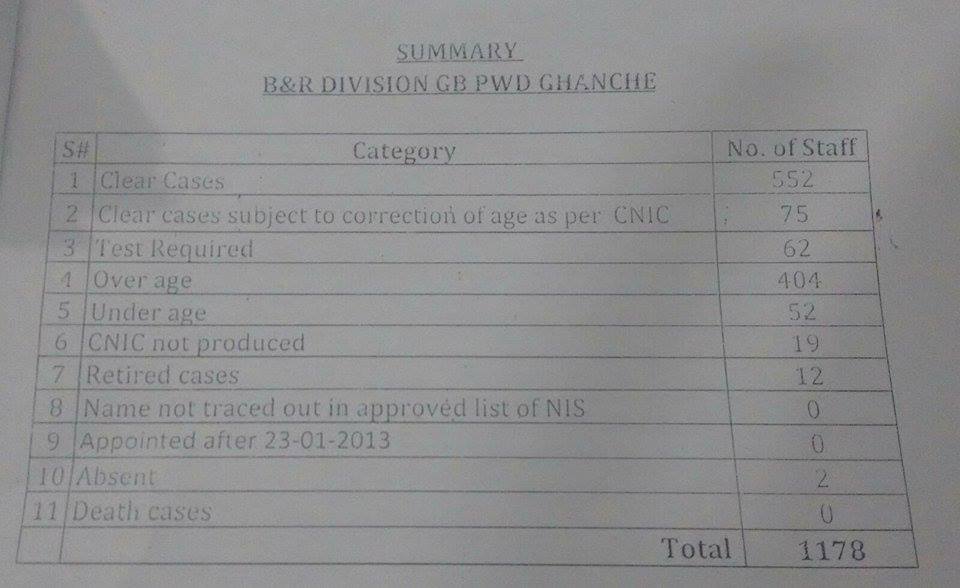 گانچھے: محکمہ تعمیرات عامہ کے 1178ملازمین میں سے 552 کو درست قرار دیا
