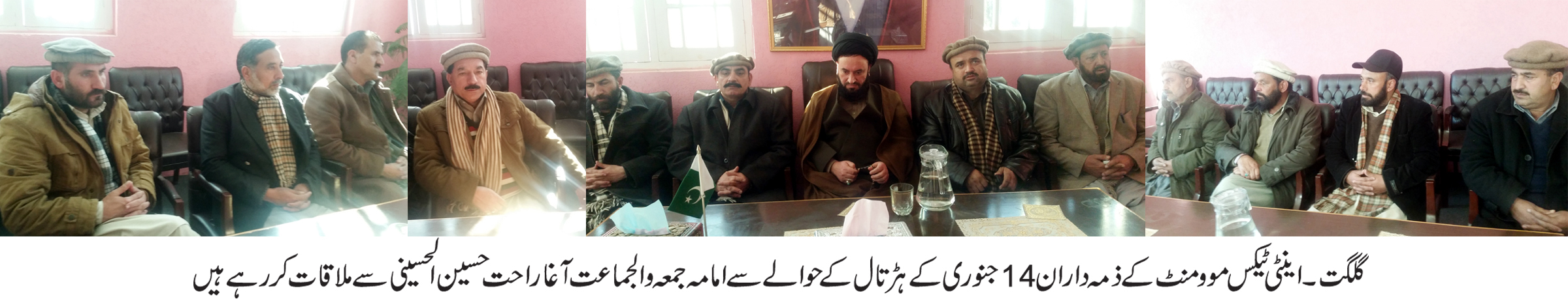 گلگت (پ ر) اینٹی ٹیکس موومنٹ نے 14جنوری کے شٹرڈاون ہڑتال اور پہیہ جام کو کامیاب بنانے کیلئے رابطہ مہم تیز کردیا اور پیر کے روز امیر تنظیم اہل سنت والجماعت گلگت بلتستان وکوہستان مولاناقاضی نثار احمد اور امام جمعہ والجماعت مرکزی امامیہ مسجد آغا راحت حسین الحسینی سے الگ الگ ملاقاتیں کیں اور اینٹی ٹیکس موومنٹ کے ایجنڈے سمیت گلگت بلتستان میں عائد جابرانہ ٹیکسز کے خلاف جاری تحریک کے حوالے سے مذہبی قائدین کو آگاہ کیا اور تحریک کو کامیاب بنانے کیلئے تعاون کی اپیل کی اینٹی ٹیکس موومنٹ کے اراکین سے گفتگو کرتے ہوئے امیر تنظیم اہل سنت والجماعت گلگت بلتستان و کوہستان مولانا قارضی نثار احمد اور امامہ جمعہ والجماعت مرکزی مسجد ا مامیہ گلگت سید آغا راحت حسین الحسینی نے گلگت بلتستان کے آئینی حیثیت کے تعین سے قبل ٹیکس عائد کرنے کے اقدام کی شدید الفاظ میں مذمت کرتے ہوئے کہا ہے کہ ٹیکس کیخلاف جاری تحریک میں بھرپور ساتھ دیں گے اور اینٹی ٹیکس موومنٹ کے اراکین کے ساتھ بھرپور تعاون کریں گے انہوں نے گلگت بلتستان میں عائد ٹیکسز کو غیرقانونی اور غیر آئینی قرار دیتے ہوئے اسے گلگت بلتستان کے عوام پر ظلم قرار دیا انہوں نے اینٹی ٹیکس موومنٹ کے ذمہ دار کا شکریہ ادا کرتے ہوئے کہا کہ گلگت بلتستان کے عوام پر جبری ٹیکس عائد کرنے کیخلاف مضبوط اور جاندار تحریک کا آغاز کرکے گلگت بلتستان کے عوام کو بیدار کرادیا ہے اور یہ تحریک گلگت بلتستان کے عوام کو غیر قانونی ٹیکسز کے زد میں آتے ہیں ان پر احسان سے کم نہیں انہوں نے تحریک میں ہر قسم کے تعاون کی یقین دہانی کرادی اور ٹیکس کے خلاف جاری تحریک کی مکمل حمایت کا اعلان کردیا۔