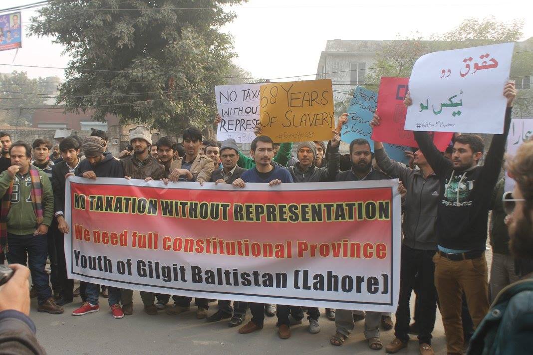 اسلام آباد میں ’’یوتھ آف گلگت بلتستان ‘‘ کی جانب سے احتجاجی مظاہرہ اتوار کی سہ پہر نیشنل پریس کلب کے باہر منعقد کیا گیا۔ جبکہ اسی طرح لاہور، گلگت اور اسکردو میں بھی پریس کلب کے باہر احتجاجی مظاہرے کئے گئے۔ اس موقع پر مظاہرین نے ہاتھوں میں مختلف بینرز اور پلے کارڈز اٹھا رکھے تھے جن پر ’’حقوق دو ٹیکس لو‘‘ ’’ ترقی کا بس ایک ہی منصوبہ، پانچواں صوبہ‘‘ ’’ گلگت بلتستان کو اقتصادی راہداری منصوبے میں مکمل نمائندگی دی جائے‘‘ کے نعرے درج تھے۔