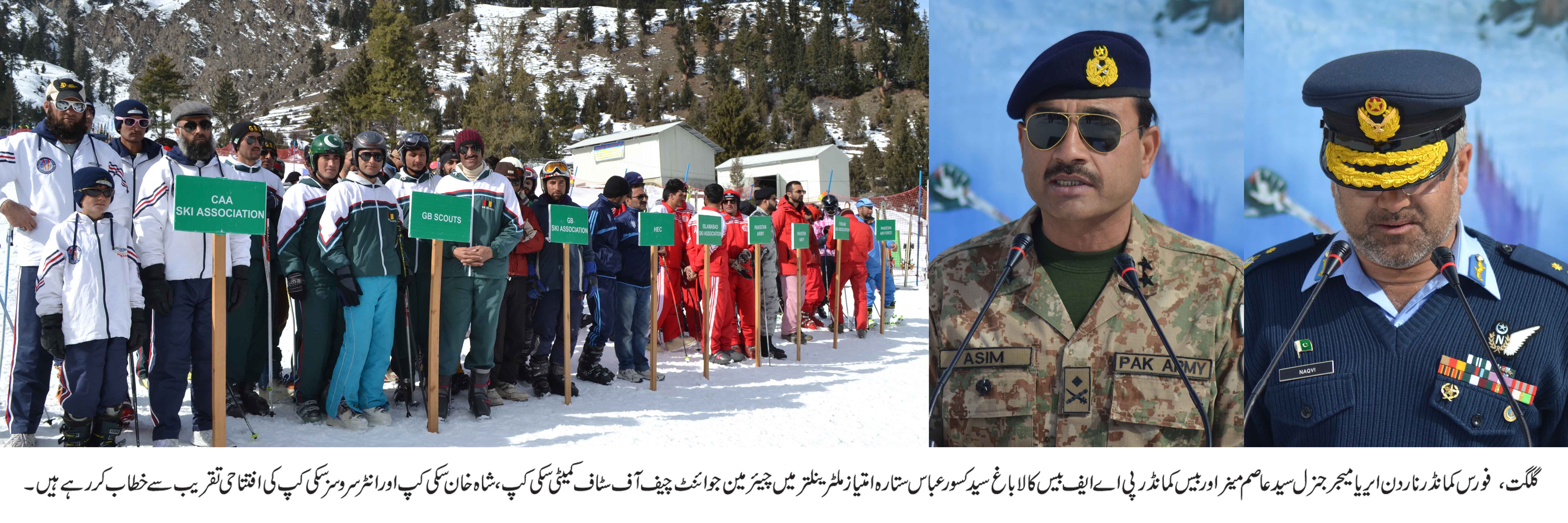 چیئرمین جوائنٹ چیف آف سٹاف کمیٹی سکی کپ، شاہ خان سکی کپ اور انٹر سروسز سکی کپ میں 11ٹیموں کے 72کھلاڑی حصہ لے رہے ہیں جن میں گلگت بلتستان سکی ایسوسی ایشن،ہائیر ایجوکیشن کمیشن،اسلام آباد سکی ایسوسی ایشن،پنجاب سکی ایسوسی ایشن،سندھ سکی ایسوسی ایشن، پاکستان آرمی،گلگت بلتستان اسکاوٹس،سول ایویشن اتھارٹی، پاکستان ایئر فورس، الپائین سکی کلب اور پاکستان نیوی کی ٹیموں نے شرکت کی ۔ تقریب کے اختتام میں کھلاڑیوں نے اپنے فن کا مظاہرہ کیا ۔