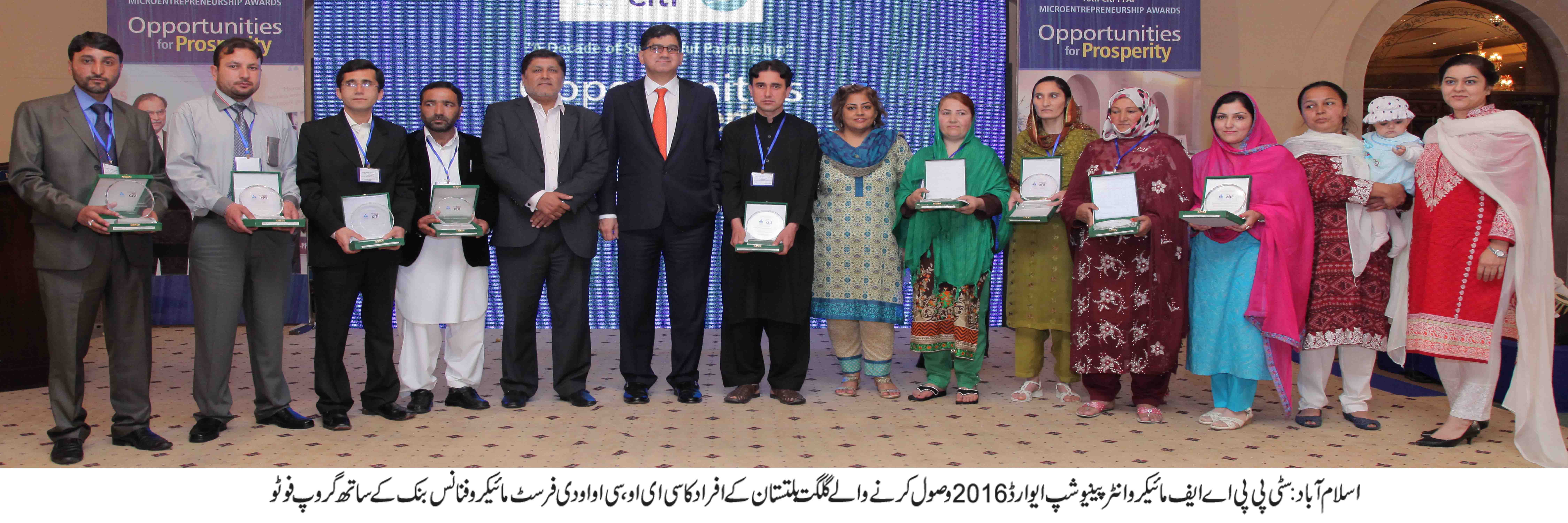 دسواں سٹی پی پی اے ایف نیشنل مائیکرو انٹر پینیورشپ ایوارڈ کی تقریب اسلام آباد میں منعقد ہوئی جس میں ملک بھر سے مختلف چھوٹے پیمانے پر کاروبار شروع کرنے والے افراد کو مختلف کٹیگریز میں ایوارڈ سے نواز گیا۔جس میں دی فرسٹ مائیکرو فنانس بنک گلگت بلتستان اور چترال ریجن کے پانچ افراد کو بہتر کارکردگی پر ایوارڈ دیا گیا۔نیشنل کٹیگری میں چترال سے تعلق رکھنے والے حبیب اللہ نے پہلی اور شکورعلی نے دوسری پوزیشن وصول کرلی۔جبکہ ریجنل میں سکینہ بی نے اول اور مرینہ بی بی نے دوسری پوزیشن حاصل کی۔