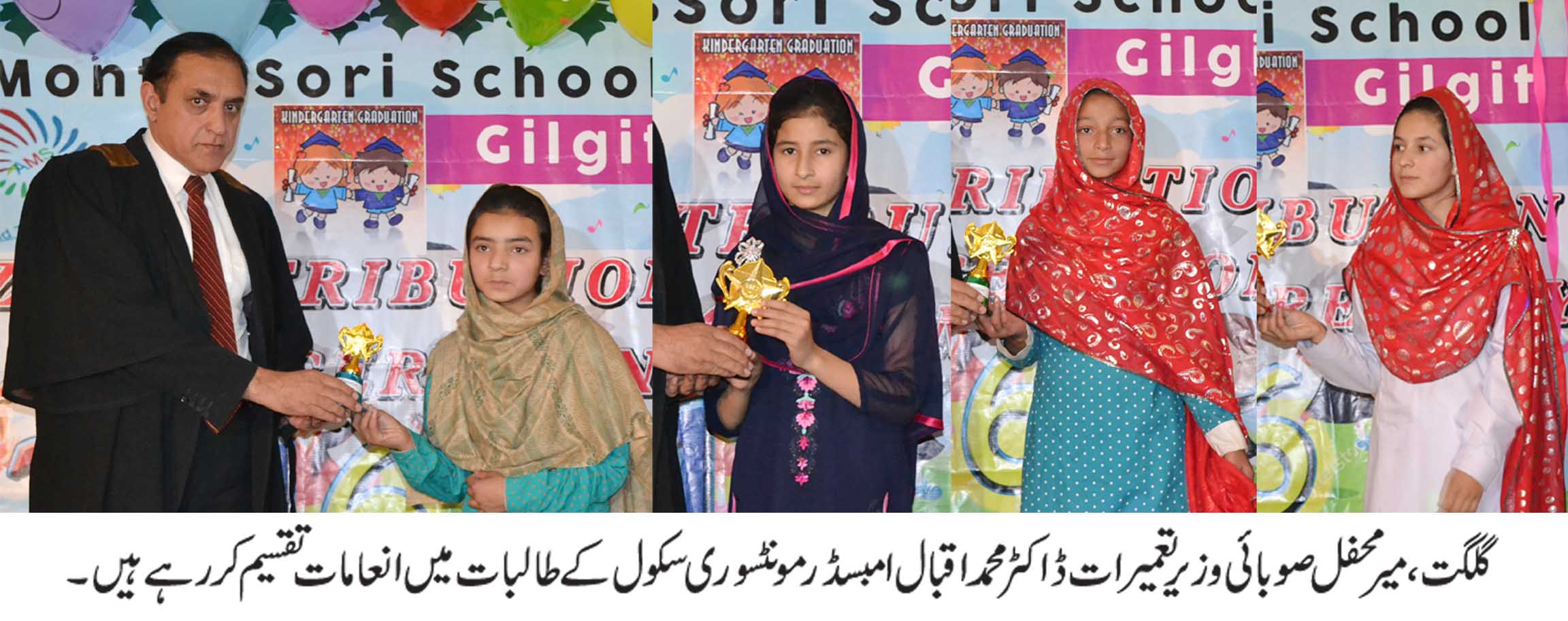 تقریب سے خطاب کرتے ہوئے میر محفل صوبائی وزیرتعمیرات ڈاکٹر محمد اقبال نے کہا کہ گلگت بلتستان میں نجی سکولوں بہت زیادہ کھل گئے مگر معیاری تعلیم کی کمی ہے معیاری تعلیم پر توجہ دینے کی ضرورت ہے۔ نجی سکولوں میں چیک اینڈ بیلنس کا ریکارڈ ہو نا چاہیے۔ سکول کی عمارت ، ماحول اور اساتذہ کی تربیت کی طرف توجہ دینے چاہیے۔ بدقسمتی سے ہمارے ملک میں دہشت گردی پھیل گئی اسکی وجہ 80کے دہائی میں ہمارے نصاب میں نفرت سکھائی گئی ۔ جس کی وجہ سے بچے بڑے ہو کر دہشت گردی میں ملوث پائے گئے۔ اللہ کا شکر ہے کہ پاکستان مسلم لیگ (ن)نے آپریشن کے ذریعے ملک سے دہشت کردی کا خاتمہ کیا۔ اب ملک پرامن بن گیا ہے۔ نیشنل ایکشن پلان بھی اس کا حصہ ہے۔ کل ہی قانون ساز اسمبلی میں بل پاس کیا ہے کہ لووڈ سپیکر کے غلط استعمال پر بھی سزا ہو گی۔صوبائی وزیر تعمیرات نے کہا کہ خواتین میں خواتین کی تعلیم پر توجہ دینی چاہیے۔اسلامی ممالک میں ایران سب سے زیادہ کواتین تعلیم یافتہ ہیں۔ ایران میں خواتین کی تعلیم پر کوئی پابندی ہیں ہے۔ہمارے ملک کو بھی ایران کے خواتین کی تعلیم پر آزادی کو فالو کرنا چاہیے۔ اُنہوں نے کہا کہ پاکستان مسلم لیگ (ن) نے گلگت بلتستان میں خواتین کی تعلیم پر خصوصی توجہ دے رہی ہے۔ اخوت میں خواتین کے لئے 40کروڑ لون مختص کیا ہے۔ میں نے اپنے حلقے میں سب سے پہلے خواتین کے لئے ڈگری کالج کی منظوری کی ہے۔ خواتین کو اپنے پاؤں پر کھڑے ہو کر اپنے خطے کی تعمیروترقی میں حصہ لیں۔ اس موقع پر مہمان خصوصی اور میر محفل نے چھوٹے بچوں میں انعامات بھی تقسیم کی۔ بچوں میں خاکے اور ٹیبلو بھی پیش کئے۔