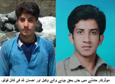 کوہستا ن(شمس الرحمن کوہستانیؔ ) کوہستان میں موٹر کار شاہراہ قراقرم سے لڑھک کر سینکڑوں فٹ گہری کھائی میں جاگری ڈرائیور سمیت 6افراد جاں بحق ، حادثے کے بعد پٹن کوہستان میں کہرام مچ گیاچاروں طرف سوگ۔وقوعے کے مطابق کوہستان کے علاقے میٹھا پانی بنکڈ کے مقام پر شاہراہ قراقرم پر المناک حادثہ پیش آیاہے۔ پولیس کے مطابق موٹر کار نمبر PSP-8پٹن سے بشام جارہی تھی کہ تیزرفتاری کے باعث ڈرائیور سے بے قابو ہوکر شاہراہ قراقرم سے سینکڑوں فٹ نیچے گہری کھائی میں جاگری ،جس کے نتیجے میں چھ افراد جاں بحق ہوگئے ۔ مرنے والوں میں مجتبیٰ ولد دواد خان ، وکیل ولد فضل الرحمن ، محمد نبی ولد ستبر، جاوید ولد خان ممبر اقوام کھشوخیل ،ڈرائیور احسان للہ ولد خان ممبر قوم مہوربک خیل ،رحیم دادولد موسم خان قوم سوگو خیل شامل ہیں،مرنے والوں میں بیشتر لوگ جواں عمر تھے۔خاندانی ذرائع کے مطابق یہ تما لوگ کراچی سے فاضل علماء کے استقبال کیلئے بشام جارہے تھے کہ راستے میں بدقسمت سواری حادثے کا شکار بنی ۔حادثے کے بعد پٹن کوہستان میں کہرام مچ گیا اور لوگ سوگ کی وادی میں ڈوب گئے۔
