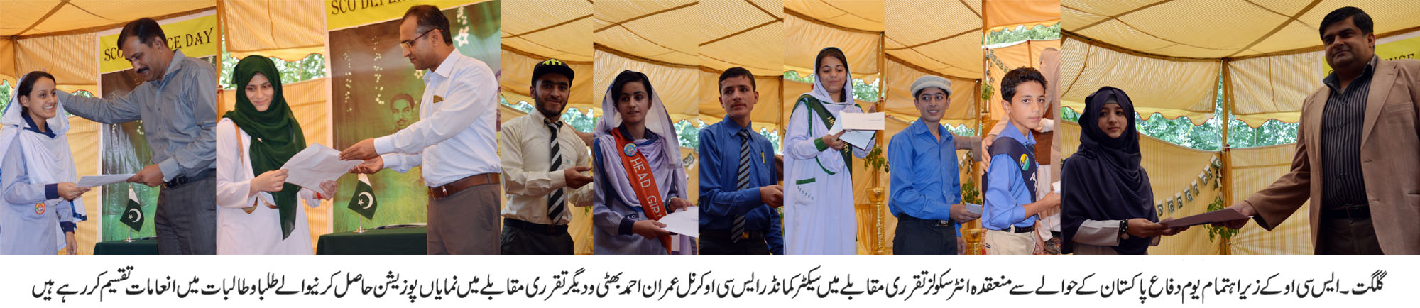 گلگت (بیورورپورٹ) 6ستمبر یوم دفاع پاکستان کے سلسلے میں سپیشل کمیونی کیشن آرگنائزیشن ایس سی او کی جانب س گلگت میں طلباء کے مابین تقریری مقابلے کا انعقاد تفصیلات کے مطابق یوم دفاع پاکستان کے مناسبت سے ایس سی او گلگت بلتستان نے گلگت اور دنیور کے16سرکاری و پرائیویٹ سکولوں کے طلباء و طالبات کے مابین یوم دفاع پاکستان کے موضوع پر تقریری مقابلے کا انعقاد کرایامقابلے میں مختلف سکولوں کے طلباء نے پرجوش تقاریر سے حاضرین سے داد تحسین وصول کیا تقریب کے مہمان خصوصی سیکٹر کمانڈر ایس سی او کرنل عمران احمد بھٹی تھے انہوں نے اپنے خطاب میں کہا کہ آج کے اس مقابلے میں شامل تمام طلباء و طالبات کو زبر دست خرج تحسین پیش کرتا ہوں اور انہوں نے بھرپور تیاری کے ساتھ مقابلے میں حصہ لیا ان کے تمام اساتذہ بھی مبارک باد کے مستحق ہیں بچوں میں اپنے ملک سے محبت اور ملی یکجہتی کے جذبے کو اجاگر کراتے ہیں آپ تمام بچے قوم کے معمار ہے اور اپنے وطن سے محبت کے جذبے کو ہمیشہ زندہ رکھنا ہے انہوں نے طلباء پر زور دیتے ہوئے کہا کہ اس ملک کا مستقبل آپ سے وابستہ ہے اورآپ نے ہی قائد اور اقبال کے مشن کو آگے بڑھانا ہے اور اس ملک کی بقاء کیلئے کسی بھی قربانی سے دریغ نہیں کرنا ہے