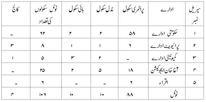 ان سکولوں کی تر تیب اس طرح سے ہے کہ حکو مت کی جانب سے منظور شدہ دو ہائی سکول اور دو مڈل سکول ہیں لیکن دو مڈل سکولوں کیلئے مدرسین کو قر بانی کا بکرا بنایا گیا ہے چونکہ وہ بغیر فنڈ کے چلا رہے ہیں اس طرح چھ پرائمری سکو لوں کو بغیر فنڈ کے مڈل کے طور پر چلایا جا رہا ہے اسی طرح ۳۸ سیپ یعنی ( SAP ) سو شل ایکشن پروگرام کے تحت چلایا جا رہا ہے۔ اور سات نن فار مل سکول کے طور پر چلائے جارہے ہیں اور کچھ نجی اور گورنمنٹ کے ملے جلے سکول ہیں جن کو پبلک سکو ل کا نام دے کر چلائے جا رہے ہیں جن کی تعداد پانج ہے۔ اس طرح کالج چار ہیں اور چار کے چار پرایؤیٹ ہیں