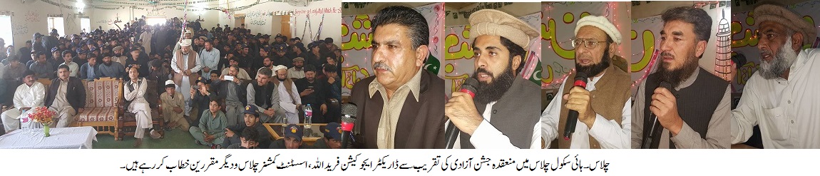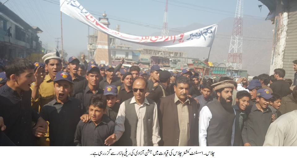 یوم آزادی گلگت بلتستان کے حوالے سے سب سے بڑی تقریب ضلع دیامر کے ہیڈ کوارٹرچلاس ہائی سکول میں منعقد کی گئی ،تقریب میں اسسٹنٹ کمشنر چلاس ظہور علی ،ڈاریکٹر ایجوکیشن فرید اللہ،سابق ڈی سی دیامر آدم شاہ اور ڈپٹی ڈاریکٹر واپڈارحیم شاہ نے خصوصی شرکت کی۔چلاس ہائی سکول میں منعقدہ تقریب سے خطاب کرتے ہوئے اسسٹنٹ کمشنر چلاس ظہور علی،ڈاریکٹر ایجوکیشن فرید اللہ،سابق ڈی سی دیامر آدم شاہ اور ڈپٹی ڈاریکٹرواپڈارحیم شاہ نے کہا کہ یکم نومبر ہماری آزادی کا دن ہے ،آج سے 69سال پہلے ہمارے بزرگوں اور اسلاف نے اپنی جانوں کے نذرانے دے کر اس دھرتی کو ڈوگروں کی تسلط اور ظلم و جبر سے آزاد کراکر ہمیں ہمیشہ ہمیشہ کیلئے آزادی دے دیا ہے ،اور آج ہم اپنے اسلاف کی قربانیوں کی پیش نظر چین اور سکون سے زندگی بسر کررہے ہیں ۔انہوں نے کہا کہ گلگت بلتستان کی ایک تاریخ اور الگ شناخت ہے ،یہاں کے مسلمانوں نے نظریاتی بنیادوں پر پاکستان سے الحاق کیا ہے ۔انہوں نے کہا کہ آج وقت کا تقاضایہ ہے کہ پاکستان یہاں کے عوام کو پاکستان سے غیر مشروط طور پر الحاق اور وفاداری کا ثبوت دینے پر انہیں مکمل طورپر قومی دھارے میں شامل کریں ۔تقریب کے دوران طلبہ نے ملی نغمے بھی پیش کیا ،اورتقریب کے اختتام پر ہائی سکول سے ریسٹ ہاوس تک ریلی بھی نکالی گئی ،ریلی میں ہزاروں لوگوں نے شرکت کیا اور گلگت بلتستان زندہ باد کے فلک شگاف نعرے بھی لگائے گئے۔