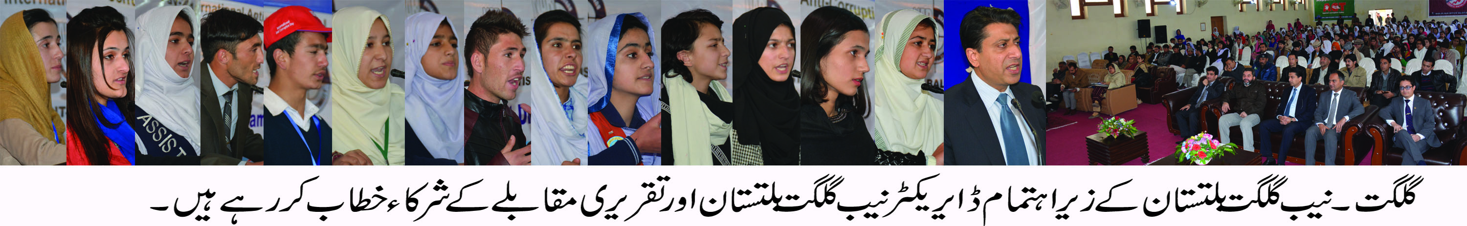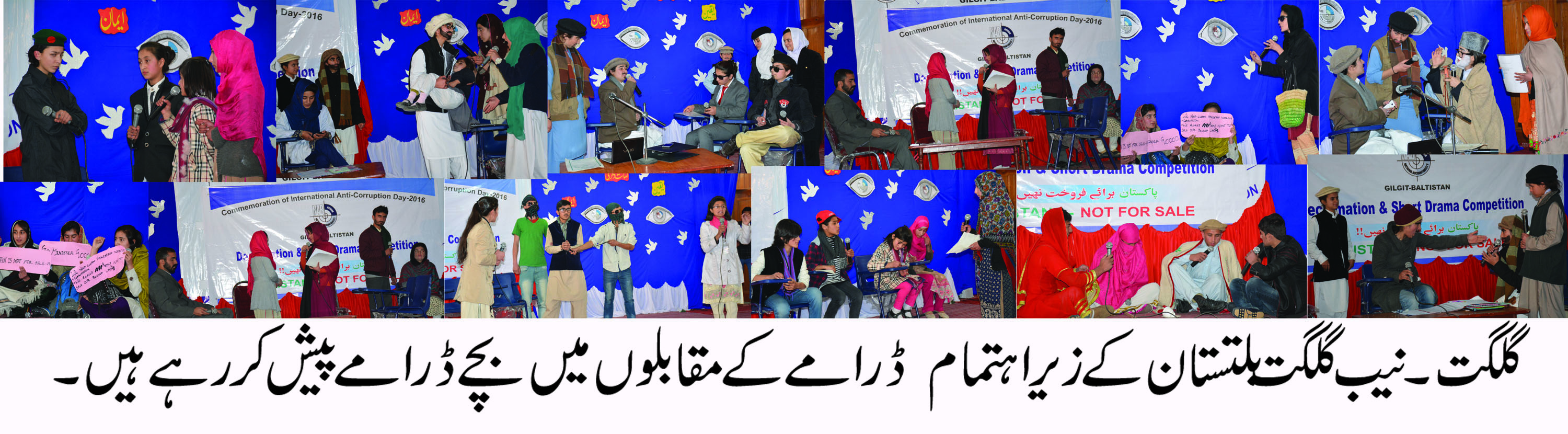 گلگت ( پ ر ) قومی احتساب بیورو کی جانب سے بدعنوانی کے خلاف عالمی دن کی مناسبت سے رشوت اور کرپشن کے انسداد کے لیئے شعور پیدا کرنے کے لیے ملک گیر مہم جاری ہے اور اس سلسلے میں گلگت بلتستان میں بھی نیب کے زیر اہتمام مختلف سرگرمیاں جاری ہیں، ان سرگرمیوں کا مقصد لوگوں میں آگاہی اور شعور پیدا کرنا ہے۔ گلگت میں اس سلسلے میں دو اہم تقاریب کا اہتما م کیا گیا جس میں سے پہلی تقریب آغا خان ہائر سیکینڈری سکول میں مختلف سکولوں کے طلباء کے مابین پینٹنگ کا مقابلہ تھا جس میں نجی اور سرکاری سکولوں کے طلبا ء نے شرکت کی۔
