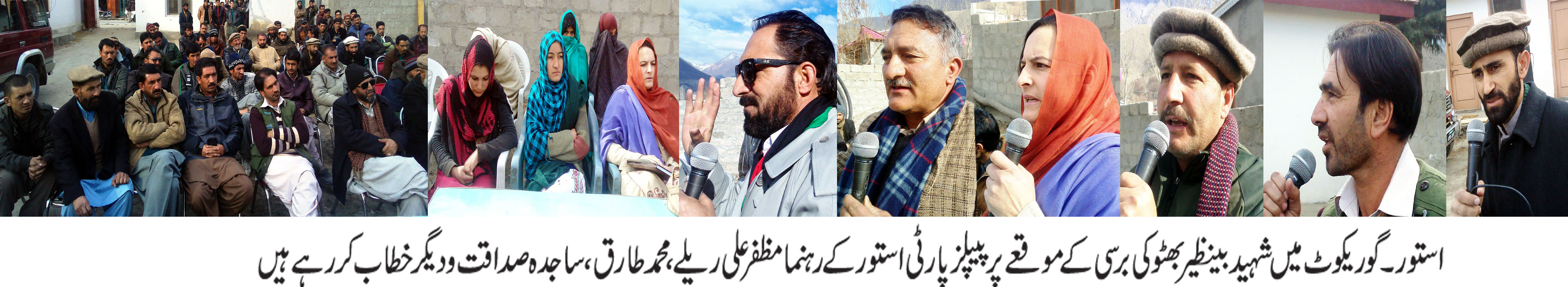 گوریکوٹ میں برسی کی تقریب کے موقعے پر عوامی اجتماع میں پاکستان مسلم لیگ (ن) کے گڑھ گوریکوٹ میں نعرہ بی بی اور جئے بی بی جیسے نعروں سے گونج اٹھا۔ اس موقعے پر درجنوں لوگوں نے پیپلز پارٹی میں شمولیت کا اعلان کیا۔ عوامی اجتماع سے خطاب کرتے ہوئے پیپلز پارٹی استور کے سنیر نائب صدر ڈاکٹر مظفر علی خان ریلے نے کہا کہ اگر گلگت بلتستان کو کسی سیاسی جماعت نے حقوق دیا ہے تو وہ پاکستان پیپلز پارٹی ہے اور آئندہ بھی گلگت بلتستان کوجو بھی حقوق ملیں گے پیپلزپارٹی کے دور میں ہی میلنگے۔ پاکستان مسلم لیگ (ن) نے گلگت بلتستان میں کرپشن کی انتہا کر دیا ہے تمام نوکریا یوں پر بولیاں لگا رہے ہیں۔ کرپشن کے خاتمے کے بڑے دعوے کرنے والے آج کرپشن کے بادشاہ بن گئے ہیں۔ اس موقعے پر پاکستان پیپلز پارٹی استور دیامر کے نائب صدر محمد طارق نے کہا کہ گلگت بلتستان میں ٹھیکوں کی کھلم کھلا بندر بانٹ ہو رہی ہے۔ ٹھیکے مند پسند لوگوں کو دیں رہے ہیں۔ انجینرنگ کونسل کی وزیر اعلیٰ اور اس کی کرپٹ ٹیم دھجیاں اڑا رہے ہیں۔ گلگت بلتستان اور پاکستان پیپلز پارٹی کا ایک بہت بڑا رشتہ ہے، آیندہ انتخابات میں گلگت بلتستان اور وفاق میں مسلم لیگ (ن) کو منہ توڑ جواب دینگے۔ اس موقعے پر خواتین ونگ گلگت بلتستان کی صوبائی صدارت کی امیدوار ساجدہ صداقت نے کہا کہ 2009میں آصف علی ذرداری نے گلگت بلتستان کو گڈ گورننس آرڈننس کے تحت صوبائی سیٹ اپ دیا۔ اس سے پہلے گلگت بلتستان سے جاگیرداری نظام کا خاتمہ کیا، آج تک جو بھی کام گلگت بلتستان کے لئے ہوا ہے وہ پیپلز پارٹی نے کیا ہے ۔مسلم لیگ (ن) حقوق دینے کے بجائے عوام سے چھینا ہیں۔ اس موقعے پر پی وائی او استور کے سابق صدر نے کہا کہ بھٹو نے گلگت بلتستان میں جاگیردار ی کانظام کا خاتمہ کیا۔ اسی طرح 2009میں صوبائی سیٹ بھی دیا۔ پیپلز پارٹی نے اپنے دور میں گلگت بلتستان کے بے روزگاروں کے لئے سینکڑوں روزگار فراہم کئے جبکہ مسلم لیگ (ن) روزگار چھین رہی ہے۔ اس موقعے پر تقرئب سے خطاب کرتے ہوئے نائب صدر شمس الدین نے کہا کہ برسی کے بعد مسلم لیگ (ن) کی کرپشن اقربا پروری ٹھیکوں میں بندر بانٹ کے حوالے سے استور میں تاریخی جلسہ ہوگا، جس میں ہزاروں کی تعداد میں لوگ شرکت کرینگے اس موقعے پر ان کے کالے کارتوت بے نقاب کیا جائے گا ۔