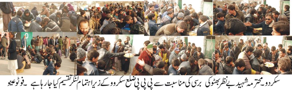 کارکنوں سے بڑے اجتماع سے خطاب کرتے ہوئے پاکستان پیپلز پارٹی گلگت بلتستان کے قائم مقام صدر عمران ندیم ، ضلعی صدر شیخ نثار سرباز، سینئر نائب صدر ضلع سکردو غلام شہزاد آغا سینئر نائب صدر وزیر محمد اقبال ، سب ڈویژن روندو کے صدر ایڈوکیٹ شہباز ، سب ڈویژن سکردو کے جنرل سکرٹیری طالب استوری ، پی پی پی سٹی سکردو کے صدر افضل سمیال ، نامور قانون دان ورہنماء پی پی پی بشارت ایڈوکیٹ ، حاجی حسنین ، پی پی یی کھرمنگ کے سینئر نائب صدر جی ایم عامر پاروی ،و دیگر رہنماوں اور عہداروں نے کہا ہے کہ شہید محترمہ بے نظیر بھٹو نے اپنے لہو سے جہوریت کوبقا بخشی ،جمہوریت کے فروغ کے لیے شہید بھٹو خاندان کی قربانیوں کو کسی صورت بھلایا نہیں جا سکتا ، بھٹو خاندان نے ملک میں حقیقی جمہوریت کے فروغ کے لیے بے پناہ قربانیاں دیں ، محترمہ شہید بی بی ، اورقائد عوام نے عوام کو حق حکمرانی دی ، اور ان کے مسائل حل کیے ، عوام دشمن عناصر نے بیرونی طاقتوں کے اشارے پر ملک کے محبوب قائدین کو ہم سے چھین لیا ، متحرمہ کا فکر و فلسفہ آج بھی زندہ ہے پیپلزپارٹی کے کارکنوں جب تک زندہ ہیں شہید بی بی کے مشن کو جاری رکھیں گے ، ملک میں قیام امن ، اور ایٹمی طاقت کے زریعے شہید بھٹو اور بے نظیر نے ملک کو دفاعی اعتبار سے مستحکم کیا ، عوام دشمن عناصر کو عوام کی بھلائی ایک آنکھ نہ بھائی اور انہوں نے اس عظیم لیڈر کو ہم سے جد ا کر دیا ، ہمارے دلوں سے شہید بی بی اور شہید بھٹو کی محبت کو کبھی ختم نہیں کیا جا سکتا ، شہید بی بی اور شہید بھٹو ہمارے دلوں پر حکمرانی کرتے ہیں ، آج بی بی کو ہم سے جدا ہوئے پورے ۹ سال بیت چکے ہیں لیکن آج بھی ان کی یاد تازہ ہے، مقررین نے عہد کیا کہ شہید بی بی کے نظریات پر عمل پیرا ہو کر ملک کو ترقی کی راہ پر گامزن کریں گے شہید بی بی کے بیٹے بلاول کارکنوں اور پاکستانی عوام کی واحد امید ہیں ، پیپلزپارٹی ضلع سکردو کے زیر اہتمام برسی کے حوالے سے کارکنوں میں لنگر بھی تقسیم کیا گیا ، جبکہ ضلعی عہدہ دران نے یتم خانے اور مدینہ کالونی سکردو میں مقیم افراد میں بھی لنگر تقسیم کیا۔