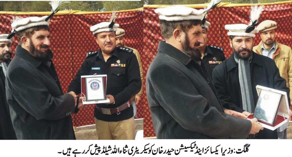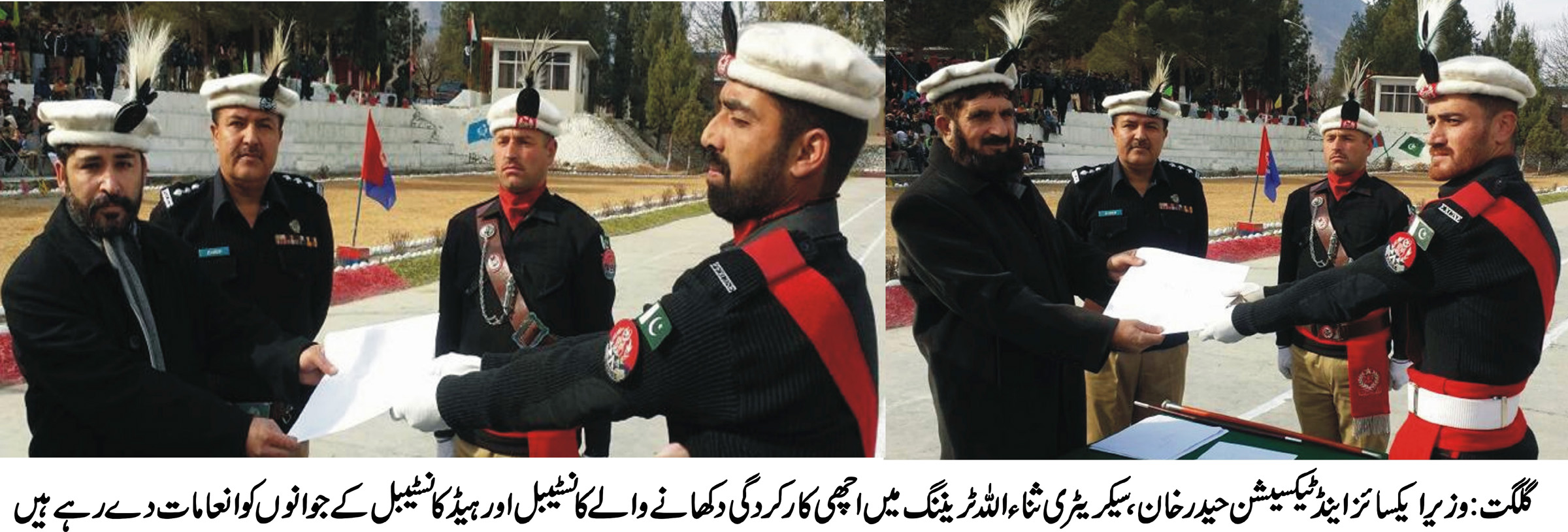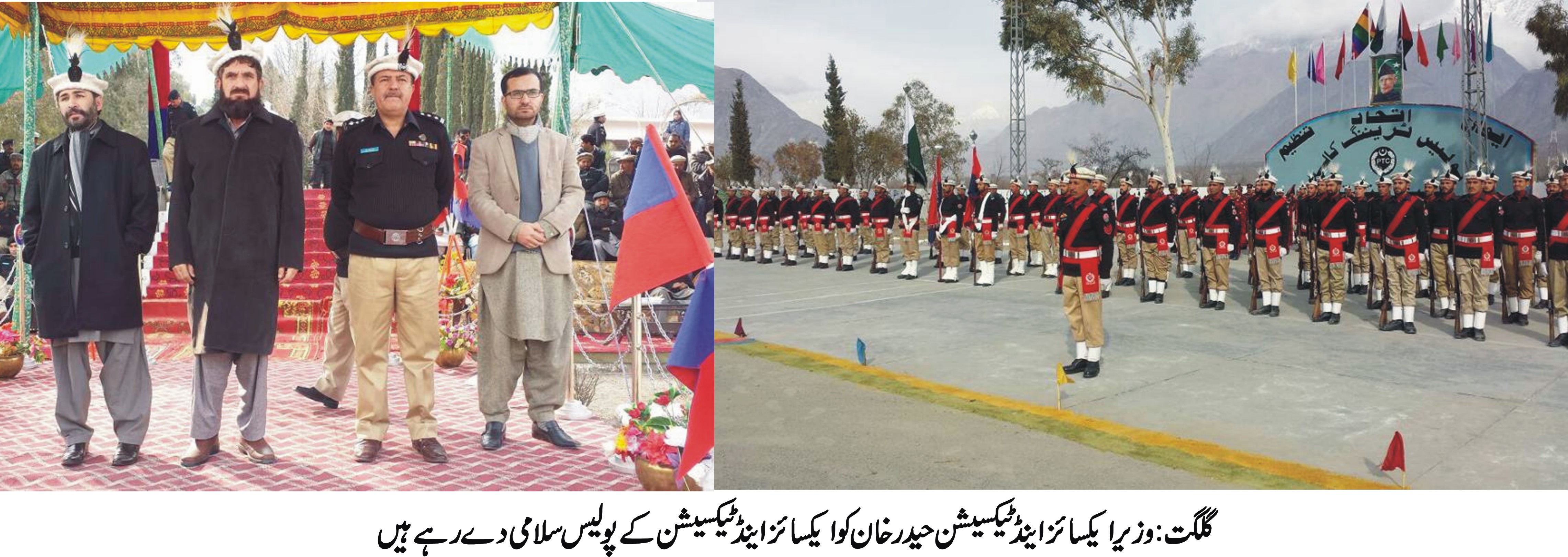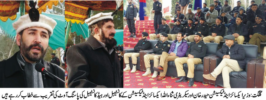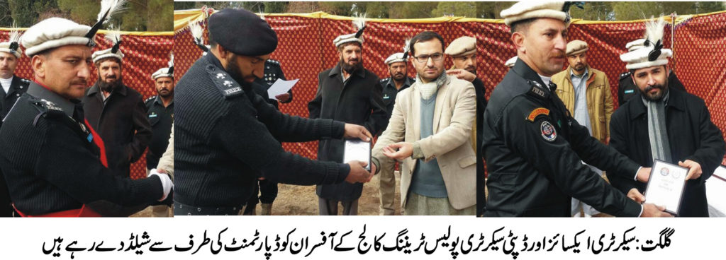 گلگت ( پ ر) ایکسائز اینڈ ٹیکسیشن ڈیپارٹمنٹ کے کانسٹیبل اور ہیڈ کانسٹیبل کی PTCسکوار میں پاسنگ آوٹ کی پر وقار تقریب کا انعقاد کیا گیا۔ تقریب کے مہمان خصوصی وزیر ایکسائز اینڈ ٹیکسیشن حیدر خان تھے۔تقریب میں سیکریٹری ایکسائز اینڈ ٹیکسیشن ثناء اللہ، ڈپٹی سیکریٹری ارشاد حسین اور ایکسائز اینڈ ٹیکسیشن ڈیپارٹمنٹ کے دیگر آفسران نے شرکت کی۔ایکسائز اینڈ ٹیکسیشن کے کانسٹیبل اور ہیڈ کانسٹیبل کی ٹریننگ ایک مہینے پر مشتمل تھی۔ دوران ٹریننگ کانسٹیبل اور ہیڈ کانسٹیبل کو اچھی کارکردگی پر سیکرٹری ایکسائز اینڈ ٹیکسیشن ثناء اللہ نے انعامات بھی دئے۔اس دوران سیکریٹری ایکسائز اینڈ ٹیکسیشن نے تقریب سے خطاب کرتے ہوئے کم وسائل کے باوجود اور کم عرصے کے دوران ٹریننگ کے انعقاد پر کمانڈنٹ پولیس ٹرینگ کالج زاہد اقبال اور دیگر افسران کا شکریہ ادا کیا۔ بعد ازاں سیکریٹری اور ڈپٹی سیکریٹری ایکسائز اینڈ ٹیکسیشن کی طرف سے پولیس ٹریننگ کالج کے آفسران کو ڈپارٹمنٹ کی طرف سے شیلڈ بھی پیش کئے گئے۔