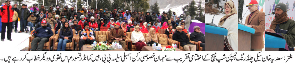 اس سے قبل خطاب کرتے ہوئے بیس کمانڈر کالاباغ و گلگت بلتستان سید قسور عباس نقوی نے کہا کہ سکی فیڈریشن پاکستان وقتاً فوقتاًمقابلے کا انعقاد کرتا ہے جس کا مقصد بین الاقوامی سطح کے کھلاڈیوں کو پیدا کرنا ہے۔ ہماری محنت اور کوششوں سے ٹریننگ کے لیے ہماری دو خواتین نے سویٹزرلینڈ اور ترکی میں مقابلوں میں حصہ لیا۔ دو خواتین پر مشتمل ٹیم فروری2017میں جاپان میں ہونے والے مقابلے میں حصہ لے رہی ہے جبکہ حال ہی میں دو خواتین سکی پلیئرز کی ورلڈ جونئیرسکی چمپئن شپ کے لیے نامزدگی ہو گئی ہے۔انہوں نے کہا کہ سکی کے فروغ کے لیے سکی سکول نلتر قائم کیا گیا اس سکول میں معیاری تعلیم کے ساتھ جدید سکی کے سامان بھی مہیا کئے گئے ہیں اور ساتھ میں بچوں کی تربیت بھی کی جارہی ہے۔انہوں نے کہا کہ میرٹ کی بنیاد پر اس سکول سے بچوں کو بین الاقوامی مقابلوں میں بھی بھیجا جائے گا۔