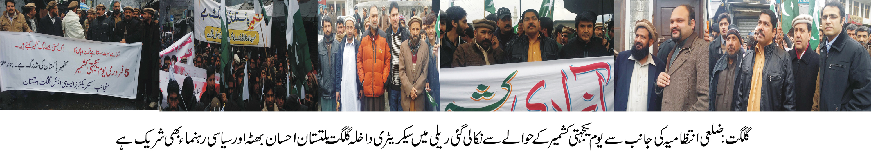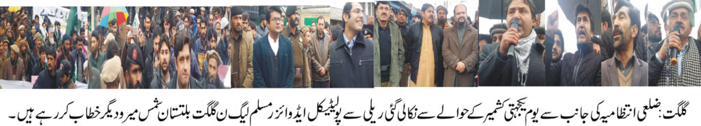 گلگت ( پ ر) یوم یکجہتی کشمیر کے موقع پر گلگت بلتستان بھر میں عوام کی بڑی تعداد نے ریلیوں میں شرکت کی اور کشمیر میں جاری بھارتی مظالم کے خلاف احتجاج کیا۔ گلگت شہر میں اس سلسلے میں سب سے بڑی ریلی اتحاد چوک پر اختتام پزیرہوئ، اس ریلی کی قیادت وزیر اعلی گلگت بلتستان کے پولیٹیکل ایڈوایزر شمس میر، خصوصی مشیر فاروق میر، حاجی عابد بیگ، ممبر جی بی کونسل ارمان شاہ، ہوم سیکریٹری جی بی احسان بھٹہ، ڈی سی گلگت حمزہ سالک اور سول سوسائٹی نے شرکت کی۔ مقررین و شرکاء نے اس بات کا اعادہ کیا کہ پاکستان کشمیریوں کے حق خود ارادیت کی ہمیشہ حمایت کرتا رہے گا اور کشمیر کی آزادی تک ہر فورم پر انکی اخلاقی و سیاسی مدد کرے گا۔ریلی میں بھارتی وزیراعظم نریندرمودی کا پتلا بھی نذر آتش کیا گیا۔