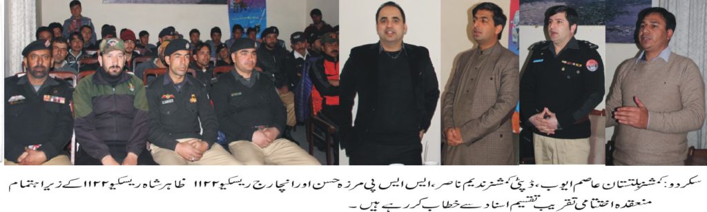 ایس ایس پی سکردو راجہ مرزا حسن نے اپنی تقریر میں کہاکہ ہر فورس کا مشن انسانیت کی خدمت ہے اور لوگوں کی جان بچانا ہے۔ اس مقصد کے حصول کیلئے اس نوعیت کے تربیت کی بڑی اہمیت ہے۔ اس نوعیت کی ٹرینگ کا سلسلہ نہیں رکنا چاہئی۔