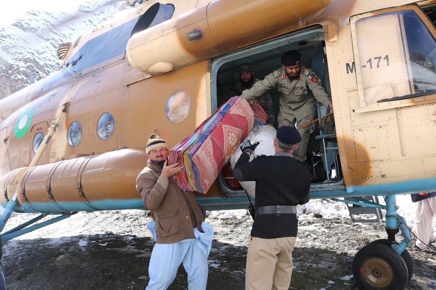 پاک فوج کے ہیلی کاپٹر میں ریلیف آئٹمز کریم آباد چترال پہنچا دئیے گئے ہیں