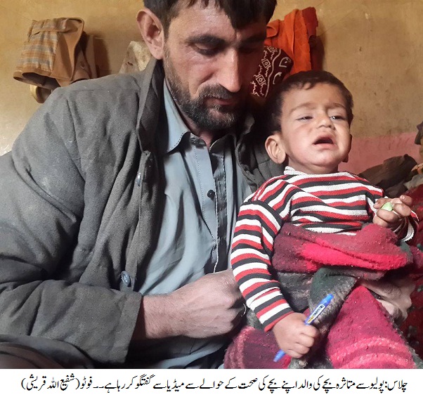 چلاس ( بیورورپورٹ ) چلاس کے علاقے تھور سے تعلق رکھنے والے 14 ماہ کے بچے میں پو لیو وائرس کا کیس مشکو ک ہو گیا ۔ بچے کی صحت دن بدن بہتر ہو رہی ہے ۔ چلاس تھور میں کم سن بچے میں پو لیو وائرس کی مو جو دگی کی خبر پھیلنے پر صحافیوں کی ٹیم نے تھور کا دورہ کیا اور مذکورہ بچے کے والدین سے ملاقات کر کے اصل حقیقت معلوم کر نے کی کوشش کی ۔ بچے کے والد کا کہنا ہے کہ بچے کا دایاں ہاتھ اوربازو حرکت نہیں کر رہا تھا ۔ جسے علاج کیلئے چلاس ، گلگت اور بعد ازاں ایبٹ آباد لے گیا جہاں ڈاکٹروں نے طبی معائنے کے بعد دو ماہ کی ادویات دی ہیں جس کے استعمال کے بعد بچے کی صحت میں کا فی بہتری آئی ہے اور بچے کے بازو اور ہاتھ صحیح انداز میں کام کر رہے ہیں ۔ اس موقع پر بچے کے ہاتھ میں ایک قلم تھمائی گئی جو کہ اس نے مضبوطی سے پکڑ لی ۔