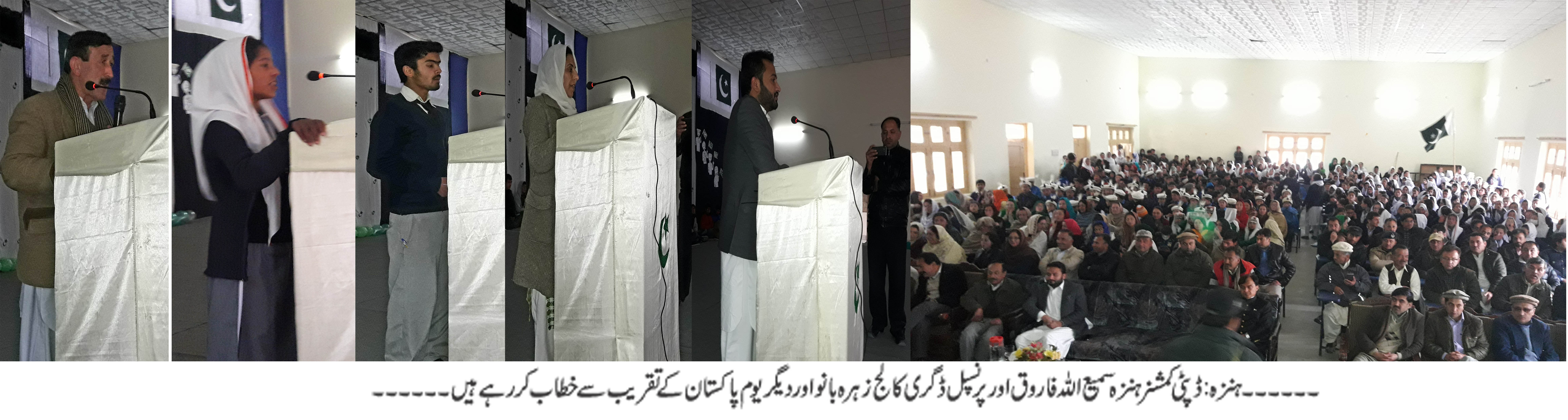 ہنزہ(رحیم امان) یوم پاکستان کے سلسلے میں ہنزہ میں ڈسٹرکٹ انتظامیہ اور محکمہ تعلیم ہنزہ کی اشتراک سے گورنمنٹ ڈگری کالج ہنزہ کریم آباد میں ایک رنگا رنگ تقریب منعقد ہوا تقریب کے مہمان خصوصی ڈپٹی کمشنر ہنزہ سمیع اللہ فاروق تھے تقریب میں اسسٹنٹ کمشنر ہنزہ ،ڈپٹی ڈائریکٹر ایجوکیشن فقیر محمد،ڈی ایچ او ضلع ہنزہ ڈاکٹر شیر حافظ کے علاوہ دیگر حکومتی عہددارن اور مختلف اسکولوں کے اساتذہ کے ساتھ ہنزہ کے مختلف سکولوں کے طالبہ و طالبات کی بڑی تعداد نے شرکت کی ۔