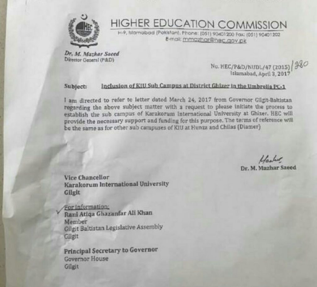 گلگت (پ ر) گورنر گلگت بلتستان میر غضنفر علی خان کی خصوصی دلچسپی سے ضلع ہنزہ اور دیامر کے بعد اب ضلع غذر کیلئے بھی قراقرم انٹرنیشنل یونیورسٹی کا کیمپس منظور ہوا۔ہا ئیر ایجوکیشن کمیشن پاکستان کی جانب سے باقاعدہ نوٹیفیکیشن گورنر ہاوس کو موصول ہوئی ۔ضلع غذر میں یونیورسٹی کے قیام سے طلبہ و طالبات کیلئے بہتر مواقع ملیں گے ۔