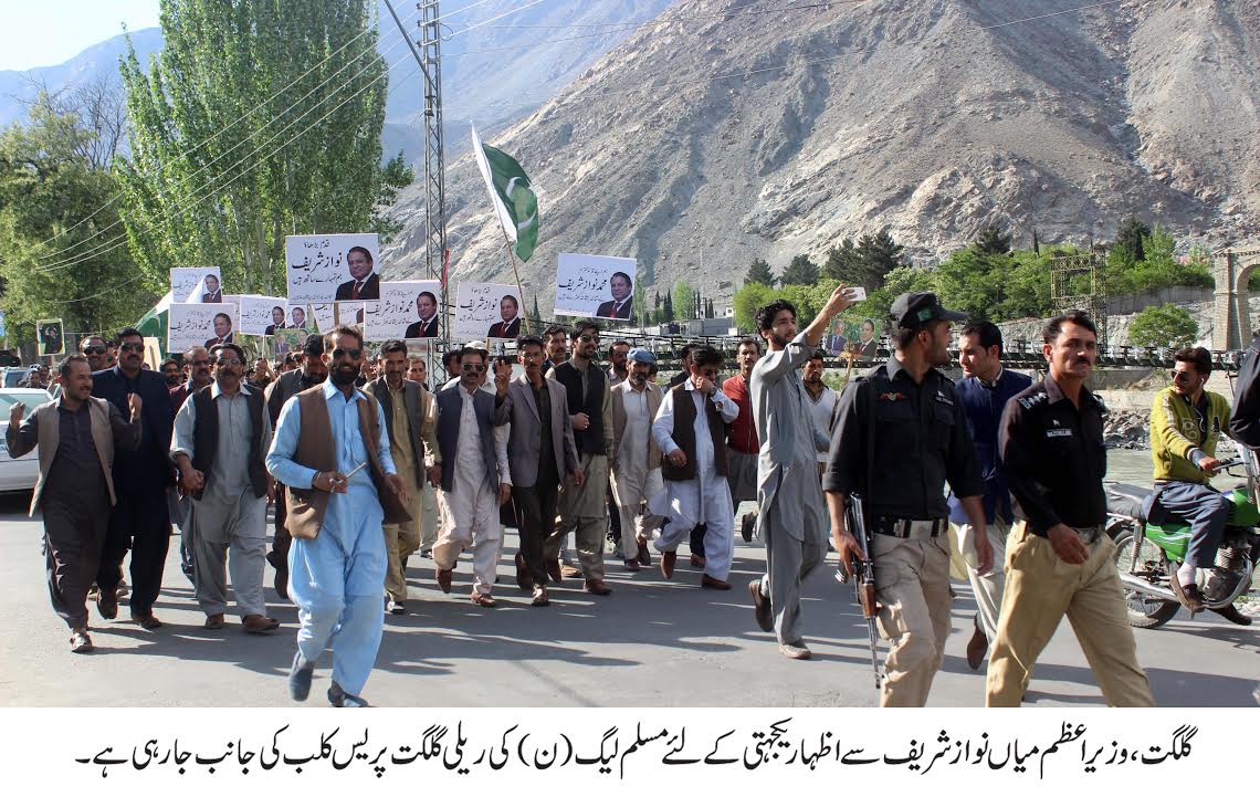 گلگت ( فرمان کریم )سپریم کورٹ کی جانب سے پاناماکیس کے فیصلے کے بعد ملک بھر کی طرح گلگت بلتستان میں بھی مسلم لیگ ن کے کارکنوں نے وزیر اعظم محمد نواز شریف سے یک جہتی کا اظہار کر تے ہوئے ریلیاں نکالی ۔صوبائی دارلحکومت گلگت میں مسلم لیگ ن کے صوبائی سیکریٹریٹ سے گلگت پریس کلب تک ن لیگ نے اپنے قائد سے  اظاہار یکجہتی کی ریلی نکالی گئی جس میں ڈپٹی سپیکر قانون ساز اسمبلی جعفراللہ خان ، صوبائی وزیر تعمیرات وقانون ڈاکٹر محمد اقبال،ممبر قانون ساز اسمبلی رانی عتیقہ، اور کارکنوں نے شرکت کی ۔ ریلی کے شرکاء نے بینرز اور پلے کارڑز اٹھا رکھے تھے جن پر وزیر اعظم محمد نواز شریف کے حق میں نعرے درج تھے ۔