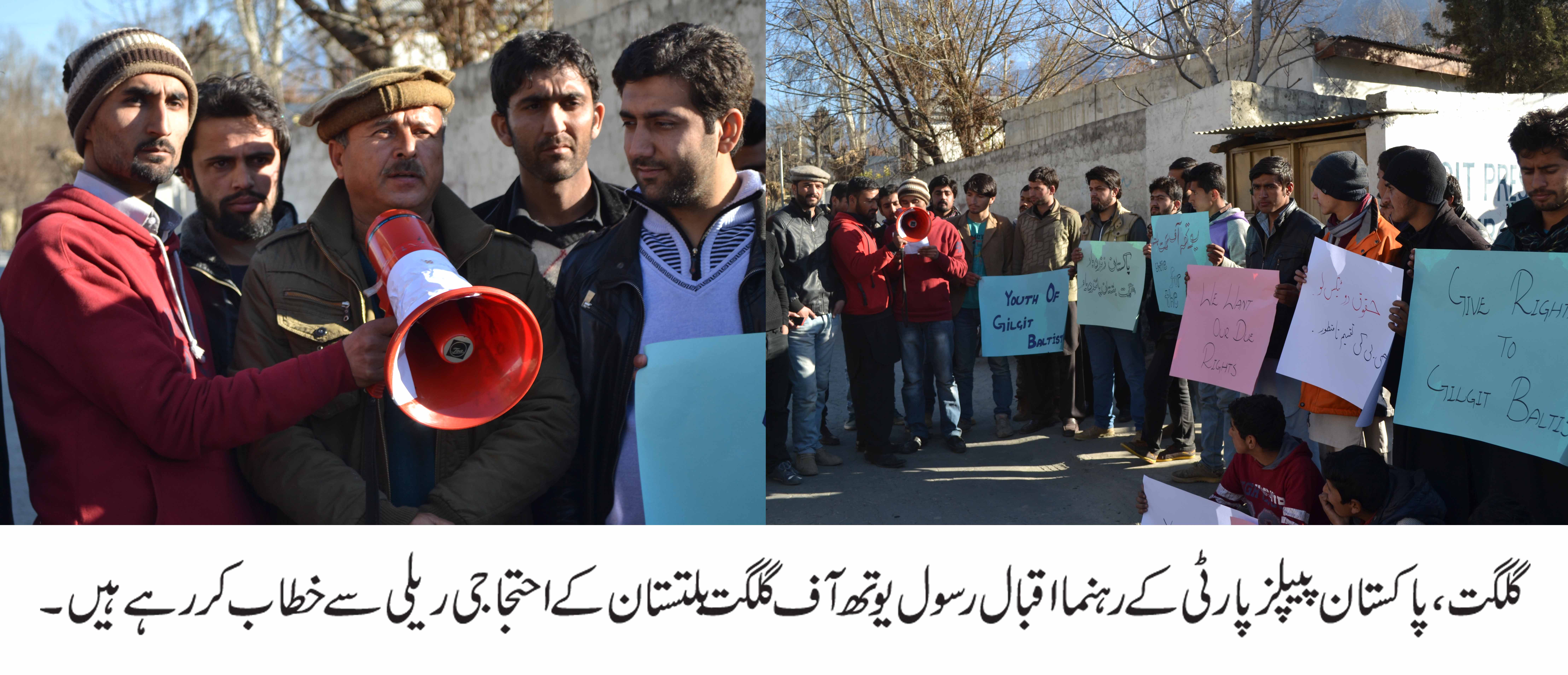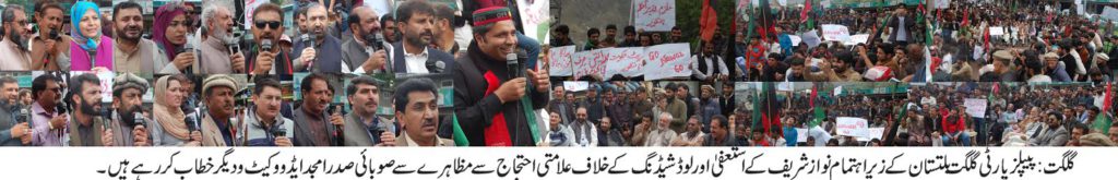 سنٹرل ایگزیٹیو کمیٹی پیپلزپارٹی کے ممبر محمد موسیٰ ،رضی الدی رضوی ،ایوب شاہ، اسلم ایڈووکیٹ ، زبیدہ زینت ،کلثوم مہدی ،انجینئر حسن علی ،سید وقار حسین ،سلطان گولڈن ،جمیل قریشی ،زوار فدا حسین و دیگر نے خطاب کرتے ہوئے کہا کہ گلگت بلتستان ہاوس سیکنڈل کی تحقیقات کے لئے فوری طور پر عدالتی کمیشن تشکیل دیا جائے اور اس میں ملوث افراد کو کیفر کردار تک پہنچا یا جائے ۔انہوں نے کہا کہ ہماری عدالتوں میں نواز شریف کی حکومت ختم ہوچکی ہے وہ فوری طور پر استعفیٰ دیں پو رے پاکستان میں دھر نے دیئے جائیں گے ۔