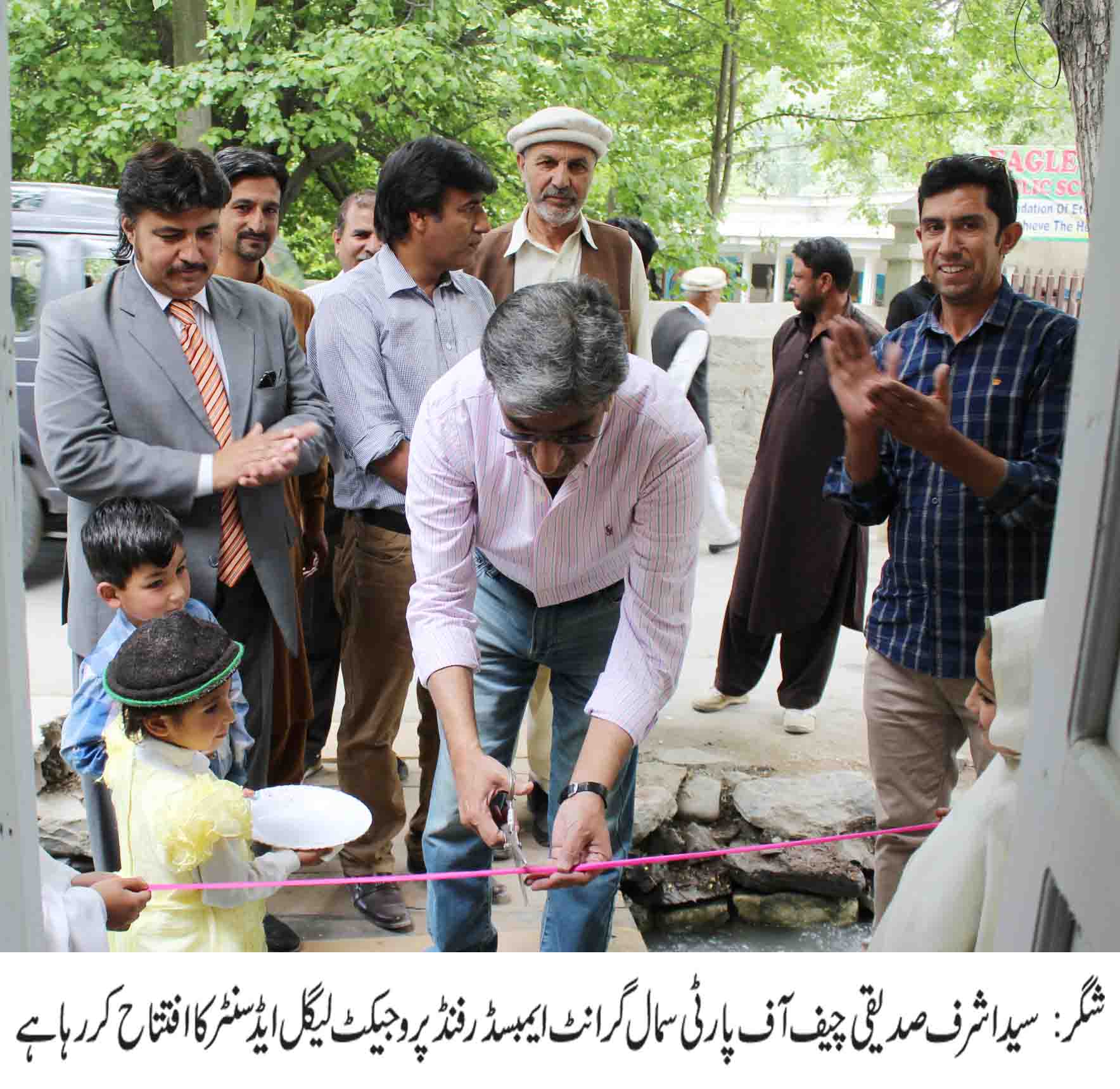 شگر میں سمال گرانٹ ایمبسڈر فنڈز پروجیکٹ یو ایس ایڈ تحت خواتین کو قانونی مشاورت دینے کیلئے قائم لیگل ایڈ سنٹر کا باقاعدہ افتتاح چیف آف پارٹی سمال گرانٹ ایمبسڈر فنڈ سید اشرف صدیقی نے کیا۔جبکہ الشہباز ویمن آررگنائزیشن کی آفس پہنچنے پر صدر سکینہ بی،ممبر بی او جی ایاز شگری اور دیگر نے انکا استقبال کیا۔تقریب سے خطاب کرتے ہوئے انہوں نے کہا کہ ر ا مشن یہاں کے اداروں کو مستحکم بنانے کیساتھ لوگوں مسائل کو حل کرنا ہے۔ ہم ان اداورں کو اس قدر مستحکم کرکے دیتے ہیں کہ ہمارے پروجیکٹ ختم ہونے کے بعد یہ ادارے خود یہاں مسائل کو حل کرسکیں۔ ہم لوگوں کو امیداور یقین کی منزل دکھاتے ہیں۔ شگر کو اللہ تعالیٰ نے بہت نوازا ہے ۔ہمیں اس بات پر فخر محسوس ہوتا ہے کہ یہ خوبصورت خطہ پاکستان کا حصہ ہے۔جبکہ یہاں کے لوگ انتہائی باشعور ہیں۔ہم مستقبل میں اس خطے میں مزید کام کرنے کے خواہاں ہے۔جی بی کام کرنے کی مجھے خصوصی دلچسپی ہے ۔ محمد جعفرجی بی کیلئے بڑی خدمات ہے ان کی جانب سے جی بی میں کام کرنے کیلئے ہمیں رہنمائی حاصل ہوتی ہے۔اس سے پہلے ممبر بورڈ آف گورننس ایاز احمد شگری نے معزز مہمانوں کو شگر کے طبعی خدوخال اور مسائل سے آگاہ کرتے ہوئے کہا کہ اللہ نے شگر کو قدرتی حسن کیساتھ بے پناہ قدرتی وسائل سے بھی نوازاہے۔کولڈ ڈیزرٹ ،پہاڑ،برف،برفانی چوٹیاں،ندی نالے ،دریاء،جیمز سٹون سب یہاں پایا جاتا ہے۔ تاہم ان وسائل کو برؤکار لانے کیلئے علاقے میں اداروں کی قیام اور تربیت گاہوں کی اہم ضرورت ہیں۔صدر الشہبار ویمن آرگنائزیشن شگر سکینہ بی نے معزز مہمانوں کا شکریہ ادا کرتے ہوئے کہا یہاں کے خواتین اپنے حقوق سے واقف نہیں جس کی وجہ سے ان کی حقوق سلب ہورہے ہیں۔ ان اداروں کے یہاں آنے سے یہاں کے خواتین کو بھی ایک امید پیدا ہوا ہے کہ ان کی حقوق کی بھی کوئی ضامن ہے ۔اس موقع پر ڈسٹرکٹ بار ایسوسی ایشن سکردو حسن جہانگیر نے لیگل ایڈ سنٹر کی قیام کو خوش آئند اور اس علاقے کی خواتین کیلئے ضرورت قراردیا۔ انہوں نے پروجیکٹ ادارہ کا شکریہ اداکیا اور کہا کہ ڈسٹرکٹ بار سکردو اس پروجیکٹ ختم ہونے کے بعد بھی اس سنٹر کو اپنی طور پر بھی قائم رکھیں گے۔