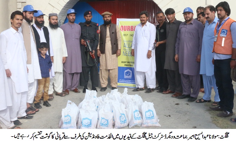 گلگت(پریس ریلیز) الخدمت فاونڈیشن گلگت بلتستان نے مستحقین کو گھر گھر قربانی کا گوشت تقسیم کر کے اپنی روایت برقرار رکھی، سینکڑوں گھرانوں کو قربانی کا گوشت گھر کی دہلیز پر مہیا کیا گیا، جبکہ ڈسٹرکٹ جیل گلگت کے قیدیوں میں بھی گوشت کے پچاس پیکٹ تقسیم کئے گئے، الخدمت فاونڈیشن گلگت بلتستان کے زیر اہتمام صوبے بھر میں قربانی پراجیکٹ 2017 کے تحت جانور زبح کئے گئے اور مستحقین کو عید کی خوشیوں میں شریک کرنے کیلئے قربانی کا گوشت تقسیم کیا گیا، امیر جماعت اسلامی گلگت بلتستان مولانا عبدالسمیع، امیر جماعت اسلامی ضلع گلگت نظام الدین ، صدر الخدمت فاونڈیشن ضلع گلگت مقصود احمد و دیگر زمہ داران نے قربانی پراجیکٹ کی نگرانی و جائزہ لیا اور ڈسٹرکٹ جیل میں گوشت بھی تقسیم کیا ۔صدر الخدمت فاونڈیشن گلگت بلتستان حبیب الرحمن نے قربانی پراجیکٹ کی کامیابی پر الخدمت فاونڈیشن کے ملازمین و رضا کاروں کو مبارک باد پیش کی ۔