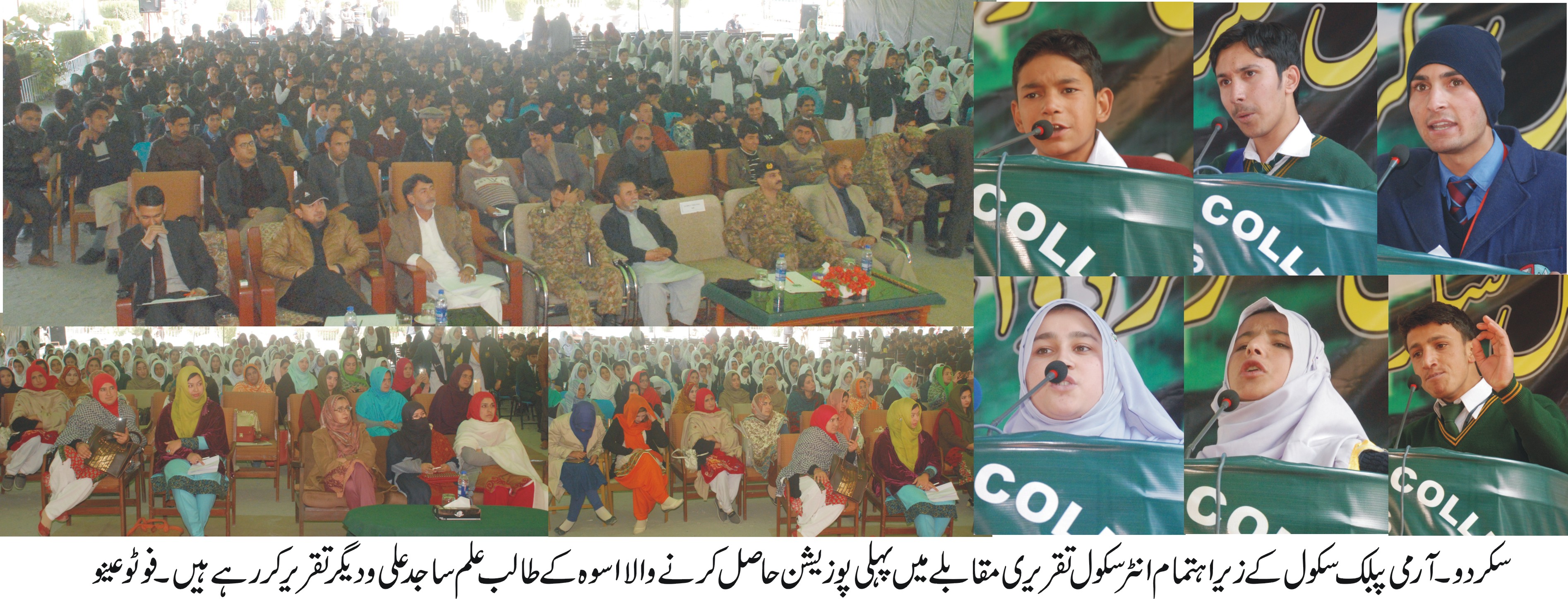 سکردو(رجب علی قمر ) اسٹیشن کمانڈر سکردو بریگیڈئر چوہدری اظہر منیر کاہلو نے آج آرمی پبلک سکول و کالج سکردو میں سکردو کے مختلف سکولوں کے مابین تقریر مقابلو ں کی تقریب سے بطور مہمان خصوصی خطاب کرتے ہوئے کہا ہے کہ بلتستان کے طلباہ و طالبات میں زبردست ٹیلنٹ موجود ہے اور یہاں کے طلباہ و طالبات ملک کے کسی بھی صوبے یا شہر کے مقابلے میں ان میں بہت اچھی صلاحیت کے حامل ہیں۔ تقریر ی مقابلو ں اورنصابی سرگرمیوں کے ساتھ ساتھ سپورٹس اور ہم نصابی سرگرمیوں میں حصہ لینے سے بچوں کی صلاحیتوں کو بہتر انداز میں اجا گر کرنے میں مدد ملے گی اور اس قسم کی سرگرمیوں کی حوصلہ افزائی ضروری ہے۔