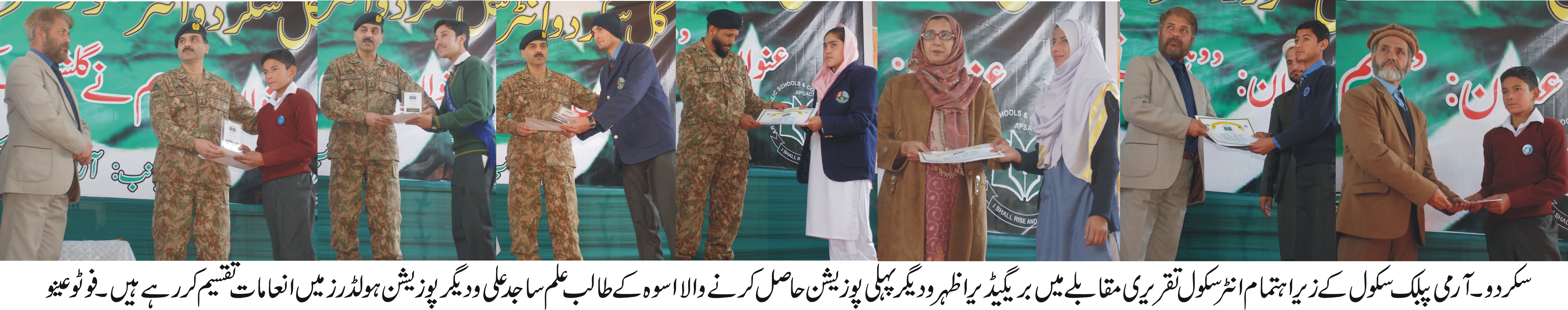 آخر میں تقریر ی مقابلے میں اول پوزیشن حاصل کرنے والے اسوہ پبلک سکول وکالج سکردو کے طالب علم ساجد ، دوئم پوزیشن کے حامل آرمی پبلک سکول و کالج کے طالب علم یعقوب اور تیسری پوزلیشن کے حامل پبلک سکول و کالج کے طالب علم شیراز کو شیلڈ دی اور ساتھ ہی جیوری کے جچز کو بھی شیلڈ سے نوازا۔