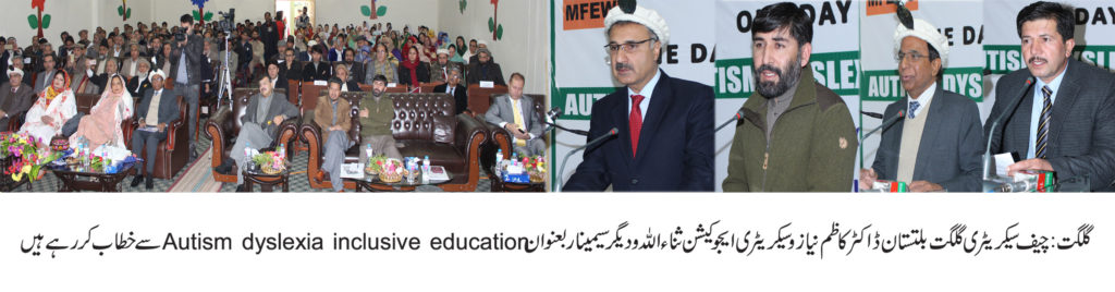 گلگت (پ ر ) چیف سیکریٹری گلگت بلتستان ڈاکٹر کاظم نیاز نے کہاہے کہ علاقے میں خصوصی تعلیم کے مراکزکا قیام عمل میں لایاجارہاہے۔ جس کے لیے سنجیدہ اقدامات کئے جارہیں ہیں۔ علاقائی زبانوں کی پذیرائی کے لیے بھی کوششیں کررہے ہیں ۔ ہمیں خطے کے خصوصی بچوں پر توجہ دینے کی ضرورت ہے تاکہ انکی حوصلہ افزائی ہوسکے خصوصی بچے تمام تر صلاحتو ں سے بھر پورہوتے ہیں ان پر تھوڑی سی توجہ معاشرے کے لیے سود مند ثابت ہوسکتی ہے ۔ اساتذہ اپنے فرائض کو احسن طریقے سے نبھائیں۔سکردو ،غذر اور چلاس میں اسپیشل ایجوکیشن سنٹرزبنارہے ہیں ۔ ان خیالات کا اظہار انہوں نے گلگت سپیشل ایجوکیشن سنٹر میں منعقدہ ایک روزہ سمینار بعنوان Autism Dyslexia and inclusive Education’کی پہلی نشست سے بحثیت مہمان خصوصی خطاب کرتے ہوئے کیا۔