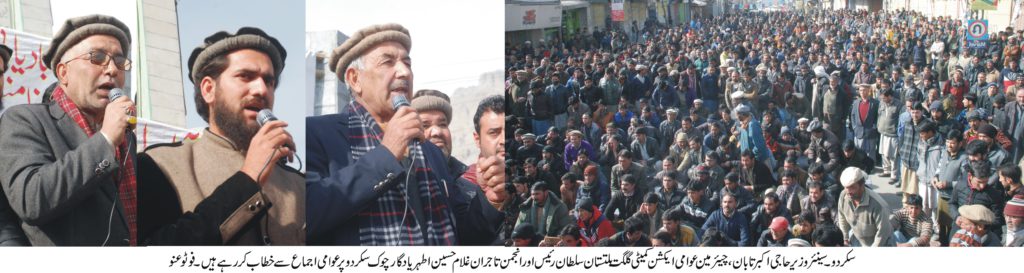 سکردو ( بیورو چیف )انجمن تاجران اور عوامی ایکشن کمیٹی نے مشروط طو ر پر بلتستان ریجن میں ہڑتال موخر کردی، تمام ٹیکسز کے خاتمے تک احتجاجی تحریک جاری رکھنے کا اعلان کیا گیا۔ سکرددو میں صوبائی وزیر حاجی اکبر تابان ،رکن کونسل وزیر اخلاق کے ہمرا ہ پریس کانفرنس میں عوامی ایکشن کمیٹی گلگت بلتستان کے چئیرمین مولانا سلطان رئیس اور انجمن تاجران سکردو کے صدر غلام حسین اطہر نے سکردو میں سینئر صوبائی وزیر حاجی اکبر تابان اور رکن کونسل وزیر اخلا ق حسین سے کامیا ب مذاکرات کے بعد صوبائی حکومت کی جانب سے لوکل ٹیکسزکے خاتمے کی نوٹفیکشن پر اطمینان کا اظہار کرتے ہوئے بلتستان ریجن میں شٹرڈاؤن اور پہیہ جام ہڑتال کو غیر معینہ مدت تک کے لئے موخر کردی ہے۔