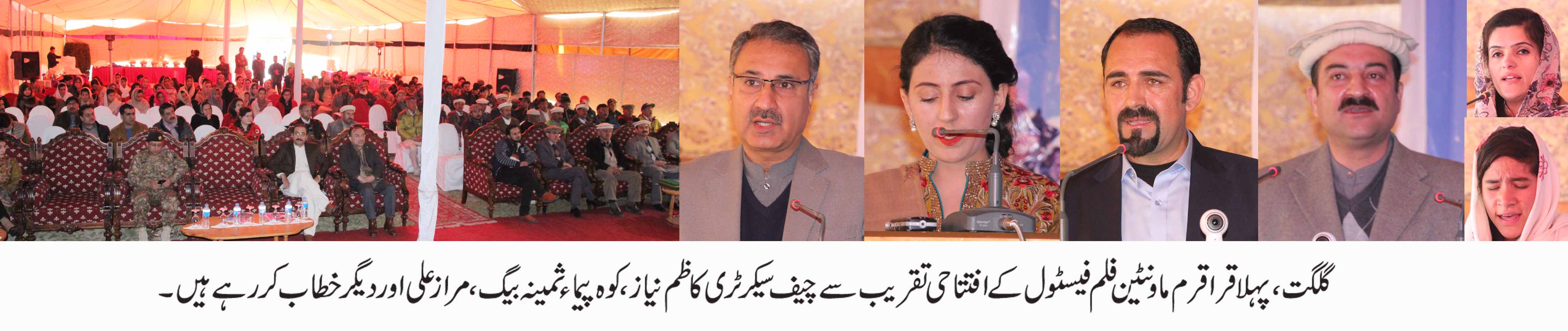 گلگت ( سٹاف رپورٹر )گلگت میں پہلا بین الاقوامی فلم فیسٹول شروع ہو گیا ہے جسے قراقرم ماونٹین انٹر نیشنل فلم فیسٹول کا نام دیا گیا ہے۔ پاکستان یوتھ آوٹ ریچ فاونڈیشن کے زیر اہتمام ہو نے والے دو روزہ فیسٹول کی افتتاحی تقریب گلگت میں منقعد ہو ئی چیف سیکرٹری گلگت بلتستان ڈاکٹر کاظم نیاز نے فیسٹول کا افتتاح کیا۔ افتتاحی تقریب سے خطاب کرتے ہوئے اْنہوں نے کہا کہ گلگت بلتستان میں اس طرح کے عالمی سطح کے فلمی میلے کے انعقاد سے جہاں علاقے میں سیاحت کو فروغ ملے گا وہاں نوجوانوں کو بھی اپنی صلاحیتوں کو اْجاگر کرنے کا موقع ملے گا۔ اُنہوں نے کہا کہ گلگت بلتستان کے یوتھ میں ٹیلنٹ کی کوئی کمی نہیں ہے ان کو موقع ملے تو ملک کانام روشن کر سکتے ہیں۔ گلگت بلتستان سیاحت کے لئے موزوں ہے ہر سال پاکستان اور بیرون ملک سیاح یہاں آتے ہیں ان سیاحوں کو بہتر موقع فراہم کرنے کے لئے انتظامیہ اقدامات کر رہی ہے۔ اُنہوں نے کہا کہ گلگت بلتستان میں خواتین کو اپنے صلاحیتوں کو بروئے کار لانے میں بہتر موقع موجود ہے ۔ یوتھ اپنے تعلیم کے ساتھ غیر نصابی سرگرمیوں میں بھی حصہ لے کر اپنے خطے کا نام روشن کرسکتے ہیں ۔ اُنہوں نے کہا کہ فلم فیسٹول میں مشہور کوہ پیماوں میں یادگاری شیلڈ پیش کر ان کی حوصلہ افرائی کی گئی جو کہ قابل ستائش ہے۔
