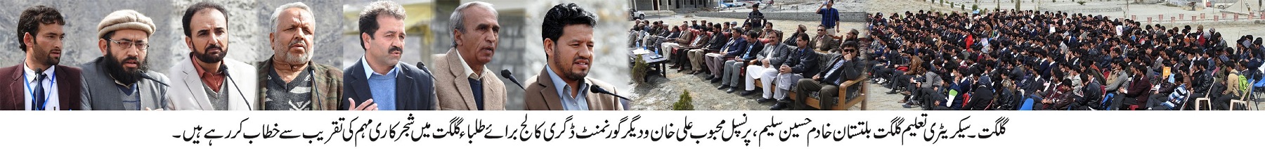 ڈگری کالج کے پرنسپل پروفیسر محبوب علی نے کانفرنس سے گفتگو کرتے ہوئے کہا کہ نیچرل فارسٹ کی حفاظت ہم سب پر فرض ہے۔ اپنے ذاتی درختوں کے ساتھ قدرتی درختوں اور جنگلوں کی بھی حفاظت ضروری ہے۔ پرنسپل نے سیکرٹری ایجوکیشن کے سامنے کالج کے تمام مسائل بیان کیے۔کالج کے پروفیسر انور جمیل نے شجرکاری مہم پر اپنی خصوصی شاعری سے سامعین کو محظوظ کیا۔انہوں نے کہا کہ ’’ کوئی شجر کوئی بوٹا لگانے آتے ہیں، اس خرابے کو جنت بنانے آتے ہیں‘‘۔لیکچرار امیرجان حقانی نے تلاوت کلام کیا اور طلبہ سے خصوصی گفتگو میں کہا کہ اسلام نے شجرکاری پر بہت زیادہ زور دیا ہے۔ آپ ﷺ نے درخت لگانے اور ان کی حفاظت کرنے والوں کے لیے بشارتیں سنائی ہے جبکہ پروفیسر اشتیاق احمد یاد نے اسٹیج سیکرٹری کے فرائض انجام دیے اور اپنی رومانوی شاعری سے طلبہ کو محظوظ کیا۔اشتیاق یاد نے طلبہ کو مخاطب کرتے ہوئے کہا کہ درخت لگانا اہم نہیں بلکہ ان کی حفاظت کرکے انہیں پھلتے پھولتے دیکھنا اہم ہے۔کالج کے ہونہار طالب علم ندیم ربانی نے شجرکاری کے حوالے تقریر میں کہا کہ جنگلات سے حاصل ہونے والی لکڑی عمارتی کاموں کے علاوہ فرنیچر،کھیلوں کا سامان اور دیگر اہم ضروریات میں استعمال ہوتی ہے۔انہوں نے یہ بھی کہا کہ درخت بقائے زندگی اور بقائے ماحول کی ضمانت ہے۔کالج کے وائس پرنسپل پروفیسر اجلال حسین نے تمام مہمانوں کا خصوصی شکریہ ادا کیا اور کالج کے اہم مسائل کی طرف توجہ بھی مبذول کرایا۔سیکرٹری ایجوکیشن اور ڈائریکٹر ایجوکیشن کے ساتھ تمام طلبہ اور اساتذہ نے شجرکاری مہم میں حصہ لیا۔ سیکرٹری نے کالج کا وزٹ کیا اور اہم مسائل پر فوری توجہ دینے کے احکامات جاری کیے ۔
