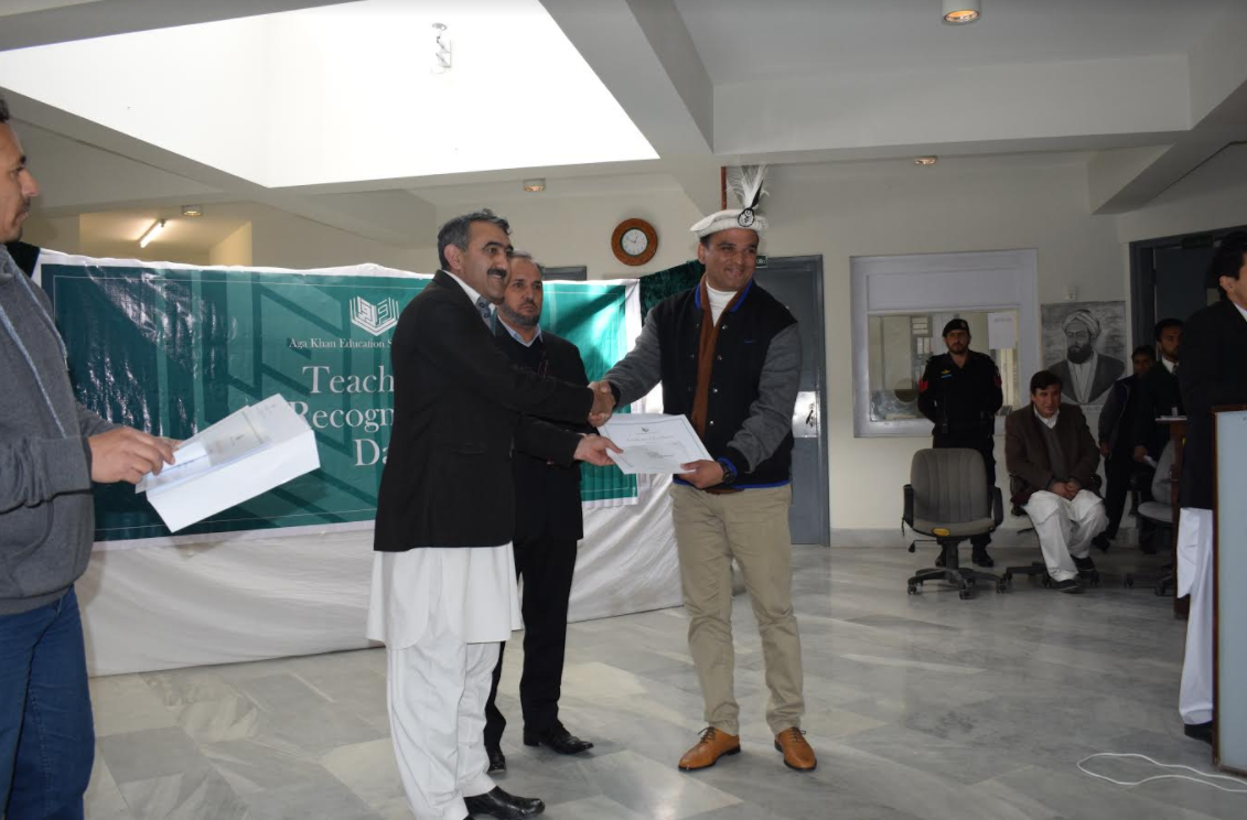 اساتذہ کی خدمات کے اعتراف میں منعقدہ اس تقریب کے پہلے حصے کے مہمان ِ خصوصی پرنسپل ڈگری کالج بونی پروفیسر ممتاز حسین تھے انہوں نے اپنے خطاب میں کہا کہ اساتذہ کی حوصلہ افزائی میعار تعلیم کو بلند کرنے کے لیے انتہائی ضروری ہے۔ اس قسم کے اقدامات کی وجہ سے بہترین لوگ تعلیم کے شعبے کی طرف آئیں گے۔ پروفیسر صاحب نے آغا خان ایجوکیشن سروس کی معیاری تعلیم کے فروع میں اہم کردار کا ذکر کرتے ہوئے کہا کہ اس ادارے سے تربیت یافتہ ٹیچرز جب گورنمنٹ سیکٹر میں آتے ہیں تو یہ اپنے اے کے ای ایس کی روایات بھی ساتھ لاتے ہیں اوراس وجہ سے سرکاری شعبے کی ترقی میں بھی بالواسطہ طور پر اے کے ای ایس کا کردار نطر آتا ہے۔