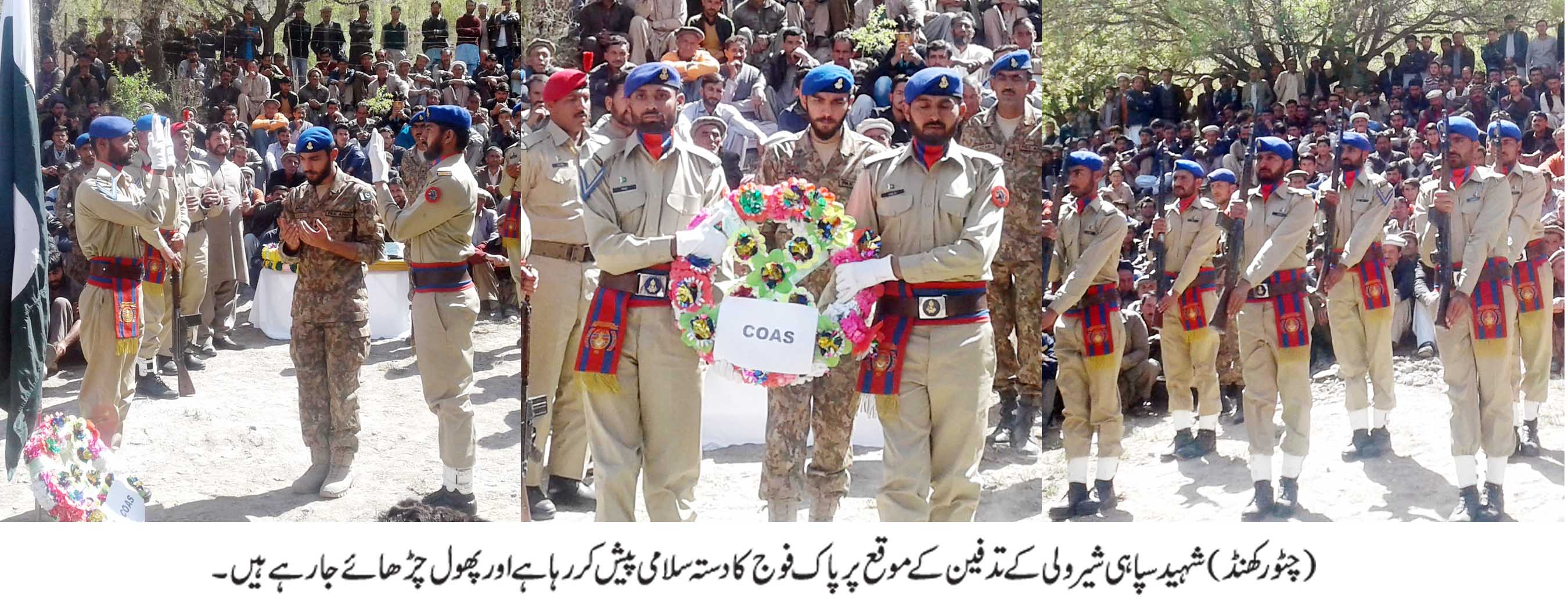 اشکومن(کریم رانجھا) ؔ پاک فوج کا جوان دوران ڈیوٹی دل کا دورہ پڑنے سے خالق حقیقی سے جاملے،شہید کو پورے فوجی اعزاز کے ساتھ آبائی گاؤں چٹورکھنڈ میں سینکڑوں سوگواروں کی موجودگی میں سپرد خاک کردیا گیا ۔پاک فوج کے چاق وچوبند دستے نے سلامی دی ،چیف آف آرمی،کمانڈنٹ 10کور اور کمانڈنٹ ایف سی این اے کی جانب سے شہید کے مزار پر پھول چڑھائے گئے ۔شہید سپاہی شیر ولی ولد کریم بیگ کا تعلق 34 بلوچ رجمنٹ سے تھااور وہ فٹبال کے بہترین کھلاڑی تھے۔اپنے یونٹ کی جانب سے کئی مقابلوں میں حصہ لیا اور کامیاب ہوئے۔شہید کے پسماندگان میں دو بیٹیاں ،ایک بیٹا اور بیوہ شامل ہیں۔
