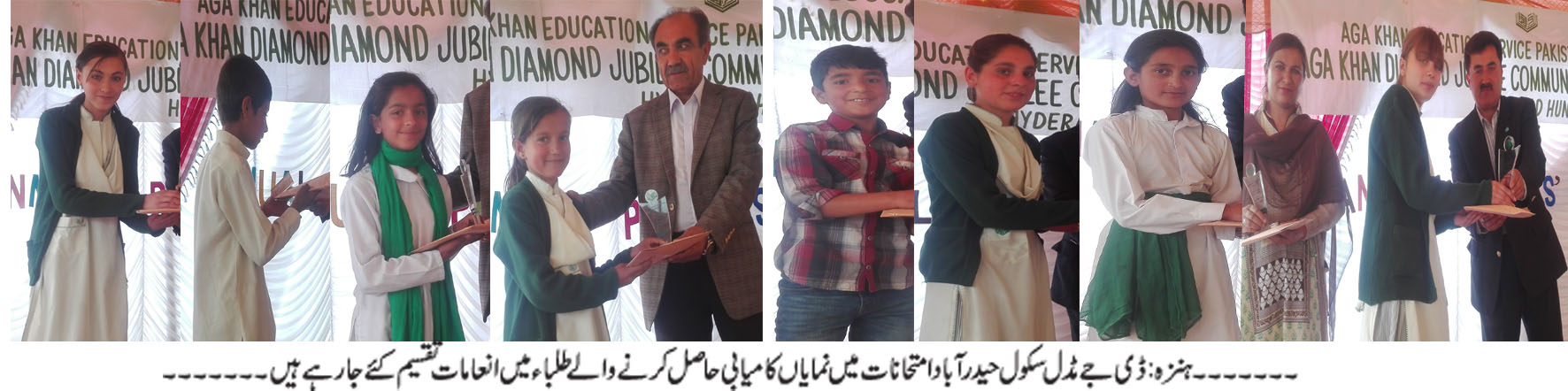ہنزہ (اسلم شاہ) آغا خان ڈائمنڈ جوبلی مڈل سکول حیدر آباد یوم والدین کے موقعے پر رنگا رنگ تقریب کا انعقاد ۔ امتحانات میں نمایاں کاکردگی کا مظاہرہ کرنے والے طلبہ و طالبات میں انعامات تقسیم ۔ سکول کا مجموعی رزلٹ 98 فیصد رہا ۔ پورے ہنزہ ریجن میں AKESPکے مرکزی امتحانات میں ٹاپ پوزیشن حاصل کرنا ڈی جے مڈل سکول حیدر کے لیے فخر کا مقام ہے ۔ امتیازاحمد چیئرمین آغاخان ریجنل ایجوکیشن بورڑ۔