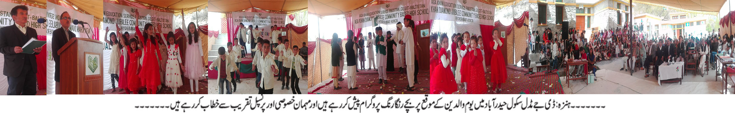 تفصیلات کے مطابق گزشتہ دنوں آغا خان ڈائمنڈ جوبلی مڈل سکول حیدر آباد ہنزہ میں یوم والدین کے سلسلے میں ایک رنگا رنگ تقریب کا انعقا کیا گیا تقریب کے مہان خصوصی امتیازاحمد چیئرمین آغاخان ریجنل ایجوکیشن بورڑبرائے ہنزہ تھے ۔تقریب میں شاہد کریم صدر اسماعیلی لوکل کونسل علی آباد و حیدر آباد ،خسرو خان کوڈنیٹر اکیڈمیکس آر ایس ڈی یو ہنزہ ،عمائدین علاقہ کے ساتھ ساتھ والدین اور اہل علاقہ کی ایک بڑی تعداد نے شرکت کی۔تقریب میں مختلف تقاریر، ڈرامیوں،خاکوں اور نغموں کی شکل میں طلبانے اپنی صلاحیتوں کا مظاہرہ کیا۔