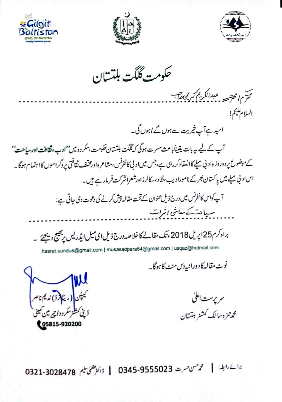یہ غالباً اپریل وسط کی بات ہے۔ ایک دن دوستِ محترم بلتستان کے نامور محقق جناب محمد حسن حسرت نے فون کرکے بتایا کہ آٹھ اور نو مئی کو سکردو میں حکومت گلگت بلتستان کی زیر نگرانی ایک قومی ادبی میلہ ہونے جا رہا ہے۔ جس میں ملک عزیز کے نامور ادبا، شعرا اور محققین کی ایک کثیر تعداد شرکت کرے گی۔ جس میں ادبا اور محققین ادب، ثقافت اور سیاحت کے موضوع پر اپنا مقالہ پیش کریں گے جبکہ شعرا اس حوالے سے اپنا کلام لے کے حاضر ہوں گے۔ حسرت صاحب نے بتایا کہ ہماری ایکیڈمک کمیٹی نے مقالہ پیش کرنے کے لیے آپ کا نام تجویز کیا ہے۔ میں نے اس عزت افزائی پر ان کا شکریہ ادا کیا اور ان سے گزارش کی کہ میں اس وقت اپنی دختر نیک اختر کے علاج کے سلسلے میں شہر قائد میں ہوں۔ میری بھرپور کوشش ہوگی کہ میں حاضر ہوجاؤں۔ مجھے جو موضوع دیا گیا تھا وہ تھا ’’سیاحت کے معاشی اثرات‘‘۔ میں نے حامی بھری لی اور مقالہ لکھا۔ مقالے کا خلاصہ حسرت صاحب، ڈاکٹر عظمیٰ سلیم صاحبہ اور موسیٰ سدپارہ صاحب کو الگ الگ ای میل کر دیا۔
