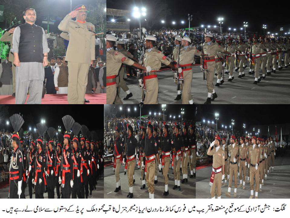 گزشتہ روایات کو برقرار رکھتے ہوئے پاک آرمی نے 71واں جشنِ آزادیِ پاکستان کے سلسلے میں مختلف تقریبات کا انعقاد کیا۔ 13/14اگست کی درمیانی شب کو گلگت میں شاندار پریڈکا انعقاد کیا گیا جس میں پاک آرمی،رینجرز، جی بی سکاؤٹس، جی بی پولیس ، ریسکیو 1122 اور آرمی پبلک سکول کے طلبا کے دستوں نے بھر پور حصہ لیا۔ تقریب میں سکول کے بچوں نے ملی نغمے پیش کیے اورمیوزیکل گالا کا اہتمام بھی کیاگیا۔ یومِ آزادی کے اس موقع پر اس بات کا عہد کیا گیا کہ ملکی سلامتی پر کسی بھی قسم کی آنچ نہیں آنے دی جائیگی۔ چند دہشتگردوں نے دیامر، خاص طور پر داریل اور تانگیرکی بہادر اور غیور عوام کو یرغمال بنانے کی جو گھناؤنی کوشش کی گئی، وہاں کی عوام نے اسے یکسر مسترد کرتے ہوئے یہ پیغام دیا ہے کہ مٹھی بھر شرپسند عناصر ایک آزاد معاشرے کو کسی طور بھی یرغمال نہیں بنا سکتے۔ اس عہد کا اعادہ بھی کیا گیا کہ قانون نافذ کر نے والے ادارے اس طرح عوام کی بھر پور اعانت کے ساتھ اور چادر اور چاردیواری کے تقدس کو ملحوظ خاطر رکھتے ہوئے، عوام کے جان و مال کی حفاظت کو یقینی بنانے کے لئے ان دہشتگردوں کو کیفرِکردار تک پہنچانے میں اپنا کردار ادا کرتی رہیں گی۔ اس موقع پر جی بی پولیس کی حالیہ واقعات میں قابلِ قدر اور قابلِ فخر قربانیوں کو بھی خراجِ تحسین پیش کیا گیا۔اور جس طرح تمام قانون نافذ کرنے والے ادارے ہم اہنگی سے اپنا کردار ادا کر رہے ہیں وہ قابلِ تقلید ہے۔اس تقریب میں کمانڈر ایف سی این اے میجر جنرل ثاقب محمود ملک، وزیر اعلیٰ گلگت بلتستان حافظ حفیظ الرحمن ، چیف سیکرٹری گلگت بلتستان بابر حیات تارڑ ، آئی جی گلگت بلتستان ثناء اللہ عباسی اور دیگراہم سیاسی وسماجی شخصیات کی کثیر تعداد نے شرکت کی۔ جشنِ آزادی کے اس موقع پرتمام شاہراؤں اور اہم سرکاری وغیرسرکاری عمارتوں کوبرقی قمقموں سے سجایا گیا ۔