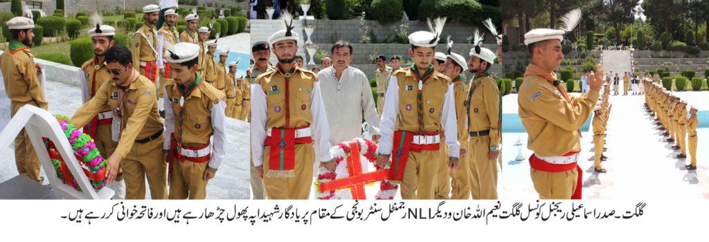 گلگت(پ ر)اسماعیلی ریجنل کونسل گلگت کے زیر اہتمام اسماعیلی ڈسٹرکٹ بوائز اسکاوٹس ایسو سی ایشن نے 6ستمبر یوم دفاع /شہدا کے موقع پر گلگت بلتستان کی تاریخ میں پہلی بار پاک آرمی کے قابل فخر رجمنٹ NLIرجمنٹل سنٹر بونجی کے مقام پر یادگارشہیدا پہ پھول چڑھایا،سلامی پیش کی اور فاتحہ خوانی کی گئی ۔اس موقع پر اسماعیلی ریجنل کونسل گلگت کے صدر نعیم اللہ خان اور مشہور عالم دین اعتمادی فدا علی ایثاراور کونسل کے ممبران نے بھی شرکت کی.