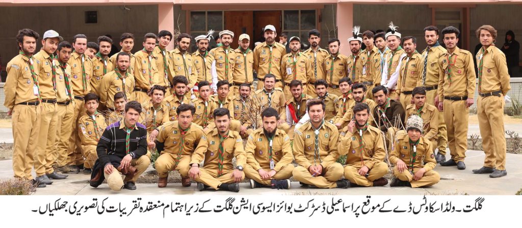 اسماعیلی ڈسٹرکٹ بوا ئز اسکاوٹس ایسوسی ایشن گلگت کے زیر اہتمام337اسکاوٹس نے اپنی خدمات سر انجام دے کر عالمی یوم اسکاوٹس منایا۔ بوائز اسکاوٹس نے گلگت شہر کے مختلف سڑکوں اور چوک پر ٹریفک پولیس کے ہمراہ ٹریفک کنٹرول کرنے کے خدمات سر انجام دیئے ۔ اس کے علاوہ ڈسٹرکٹ ہیڈ کواٹر ہسپتال گلگت اور آغاخان میڈکل سنٹر گلگت میں بھی اپنے خدمات سرانجام دئے گئے۔